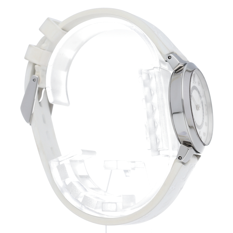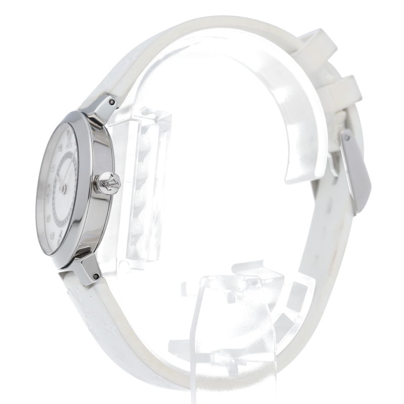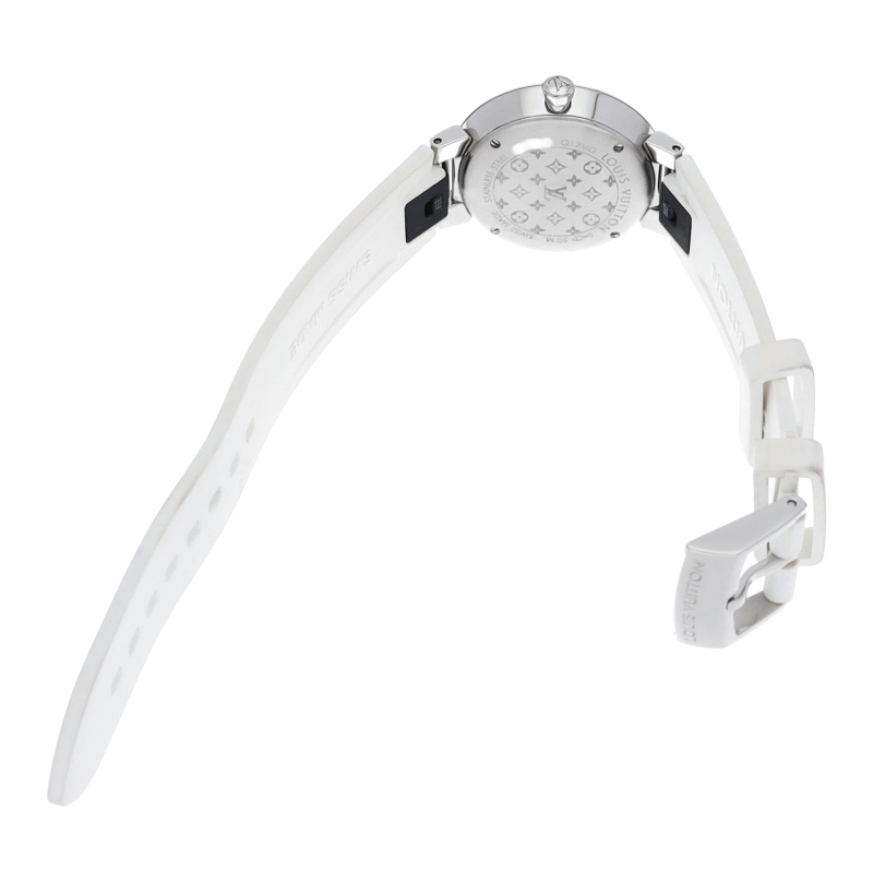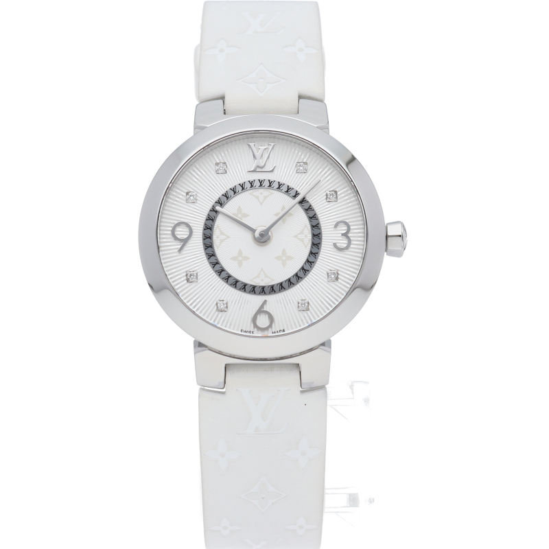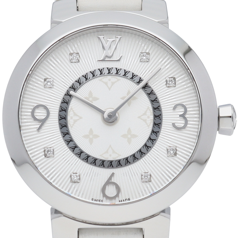 ルイ・ヴィトンのフラッグシップウォッチ「タンブール」。ルイ・ヴィトンのフラッグシップウォッチ「タンブール」。上品でシンプルなデザイン、シルバー文字盤と8Pダイヤで華やかにお付けいただけます。