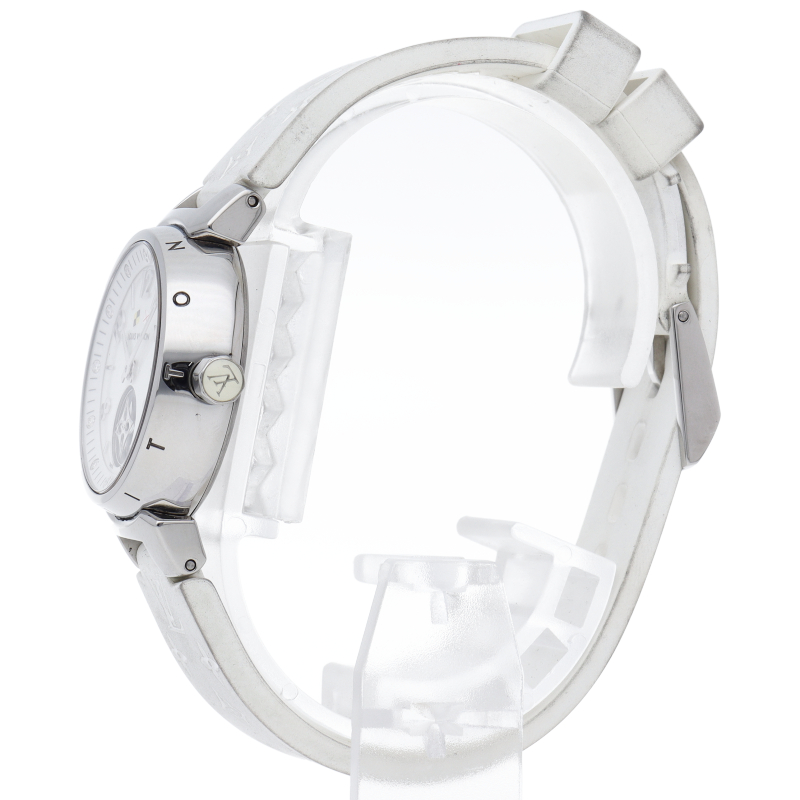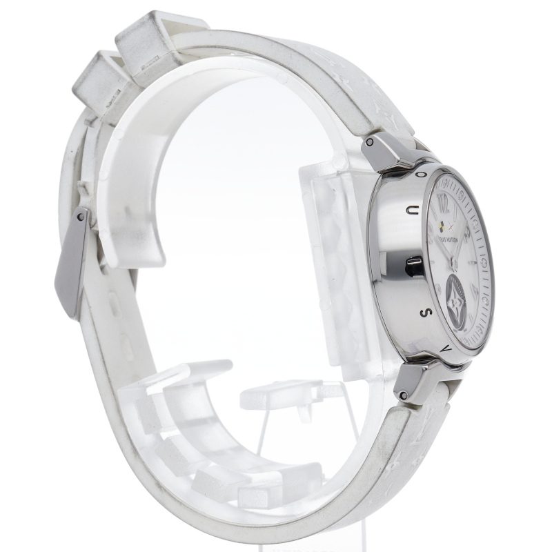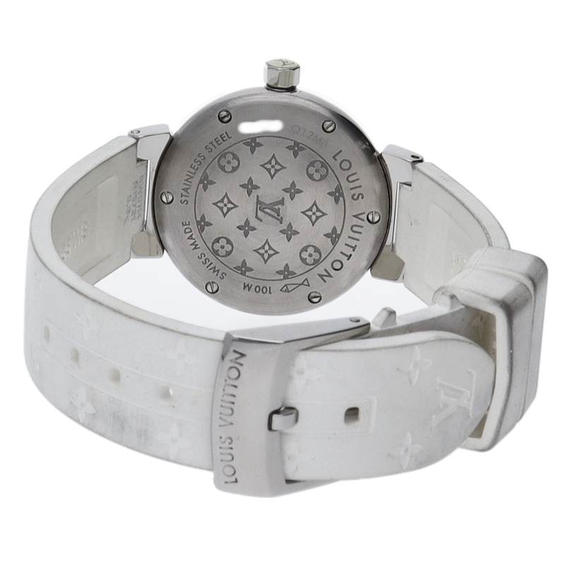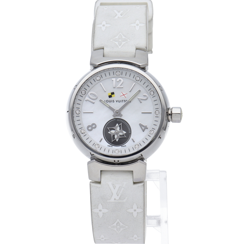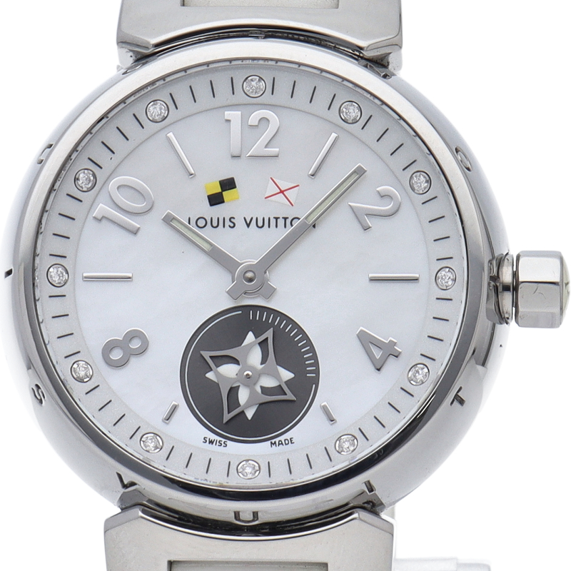 ルイ・ヴィトンのフラッグシップモデル「タンブール」の人気のラブリーカップ仕様です。ホワイトシェルの文字盤が女性らしさを引き立たせています。インナーベゼルには12Pダイヤが施されています。