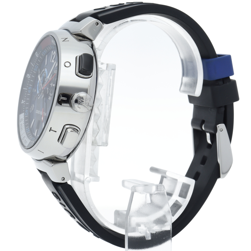 スポーティなラバーベルト、深みのあるブルーの文字盤、ルイ・ヴィトンの歴史的な「スティーマー・バッグ」のロゴ“V”からインスピレーションを得たデザインが特徴的。レガッタ機能(ヨットレース用カウントダウンタイマー)を搭載したモデルです。