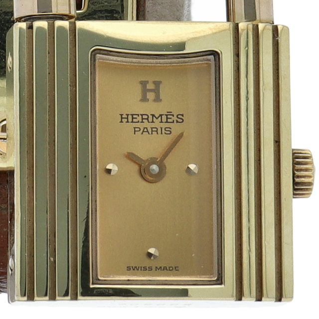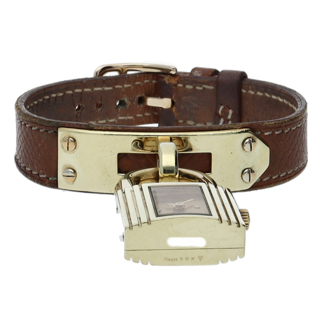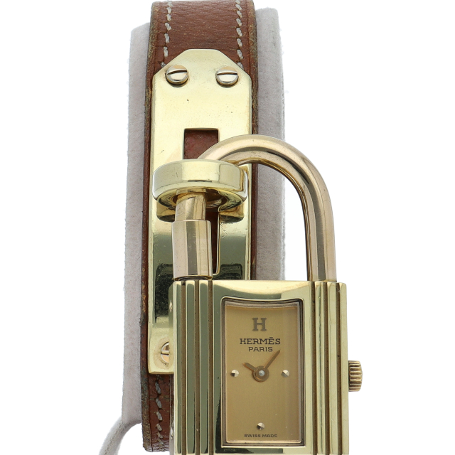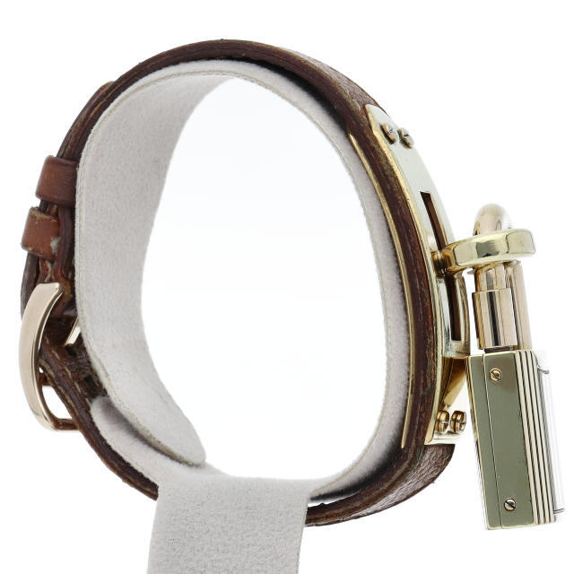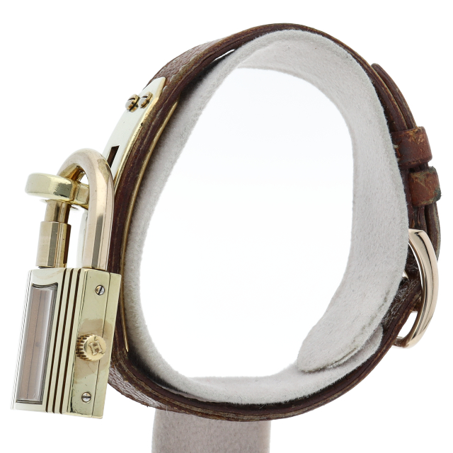 南京錠モチーフが可愛らしい、エルメスのケリーウォッチです。ゴールド金具がゴージャスで、エルメスならではの優美な雰囲気を漂わせたアクセサリー感覚でお使いいただける1本。○Y刻印。