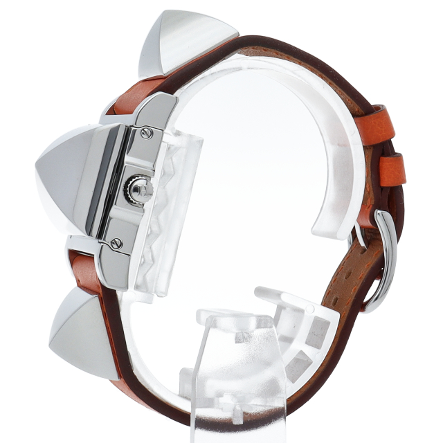 猟犬の首輪をモチーフに作られた「メドール」。パッと見た感じは時計に見えませんが、リューズを押せばワンタッチでピラミッド型のスタッズが開き時刻を表示します。ブレスレットとしても違和感なく、大きなスタッズが腕元を華奢な印象に見せてくれます。マルチに活躍してくれる一本です。