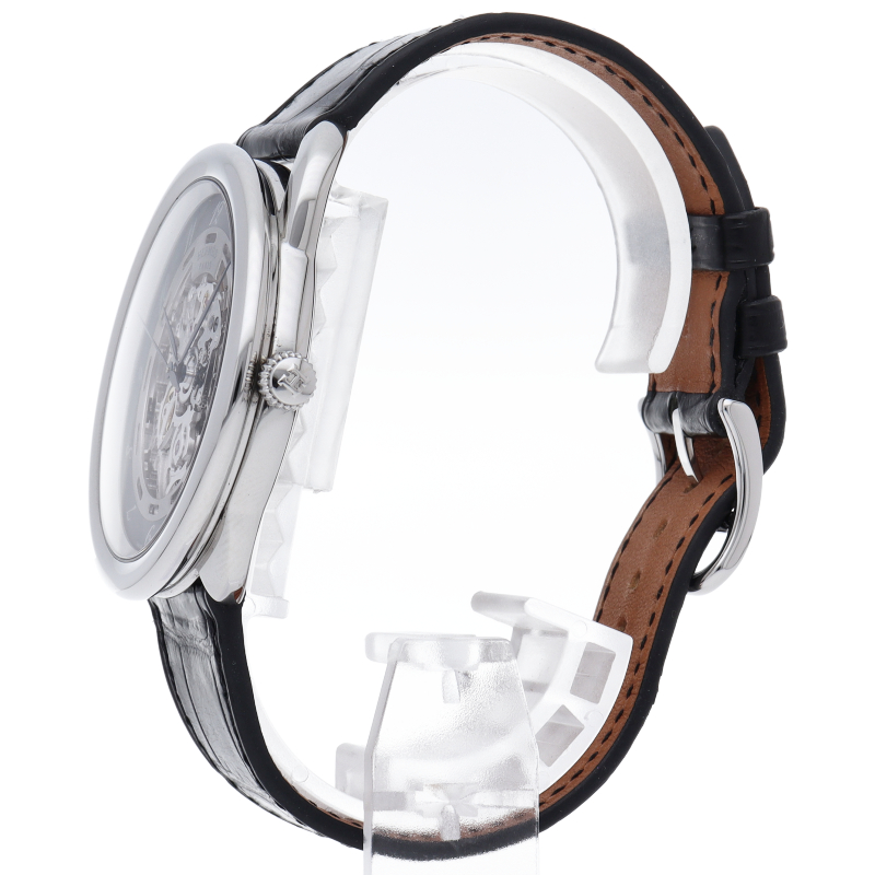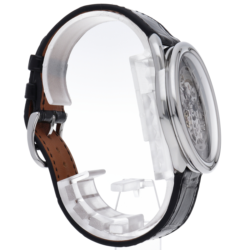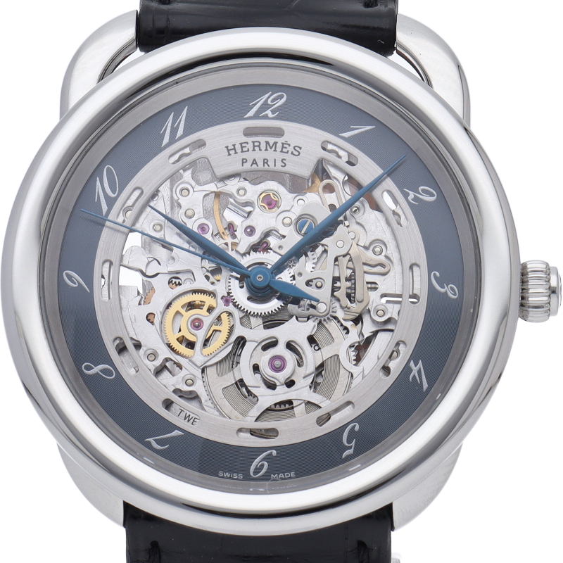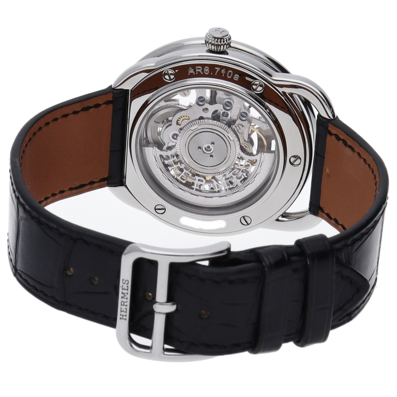 世界中で人気のセレブブランド「エルメス」。中でも“アルソー”はラウンドのケースに斜体アラビアインデックスというオーソドックスながら上品なデザインが特徴のモデルです。こちらのモデルはアルソーの基本的なデザインを踏襲しつつ、文字盤と裏蓋をスケルトンにしてゼンマイやアンクルの動きを目で楽しめるようになっています。□P刻印。