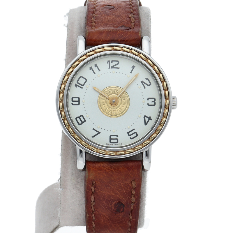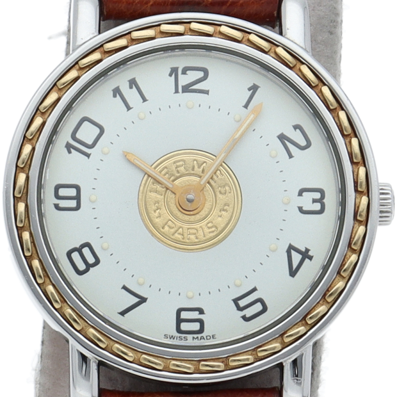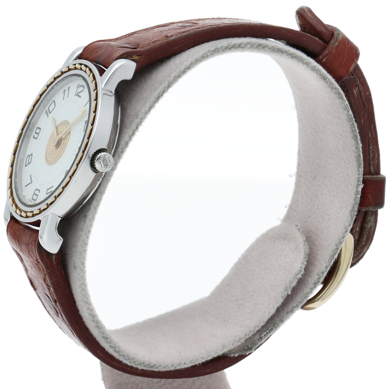 USED品。ベゼルにステッチ模様を配し、文字盤中央にセリエコインを施したこの時計は、エルメスらしい上品さと繊細さを併せ持った非常に優雅な逸品です。オーストリッチの純正ベルトを使用しており、存在感ある大人の時計に仕上がっています。