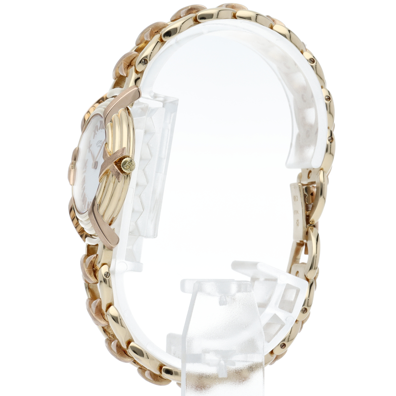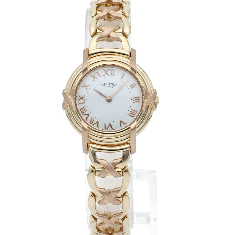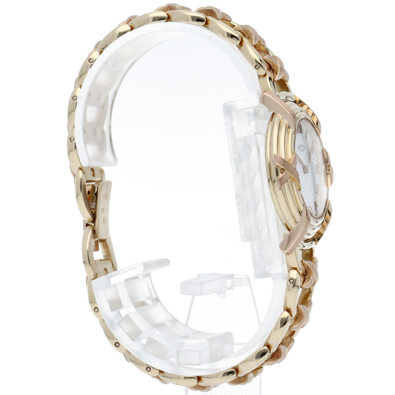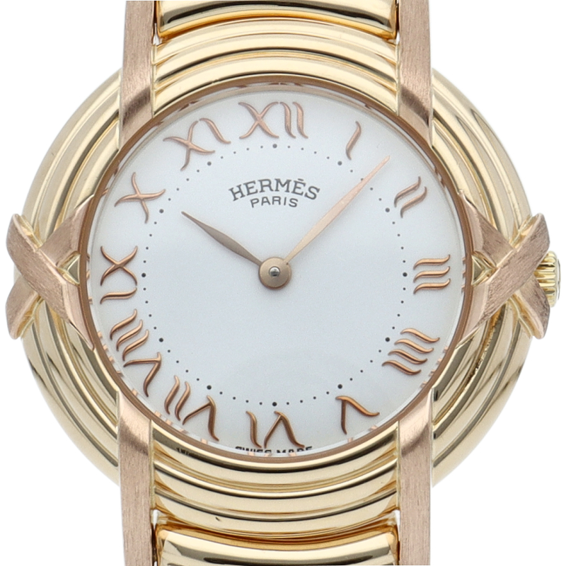 エルメスのレディースウォッチの中でも程よくシンプルな文字盤が人気の「ル バン」。ホワイトの文字盤にイエローゴールドのケースがマッチし、リボンのようなデザインのブレスレットが華やかに手元を彩ります。