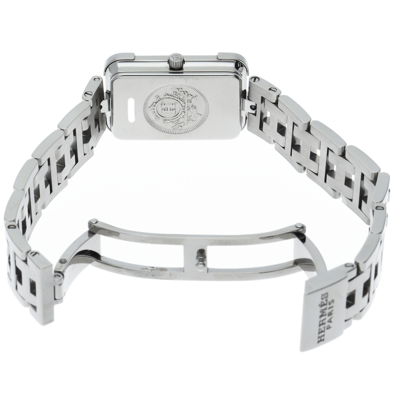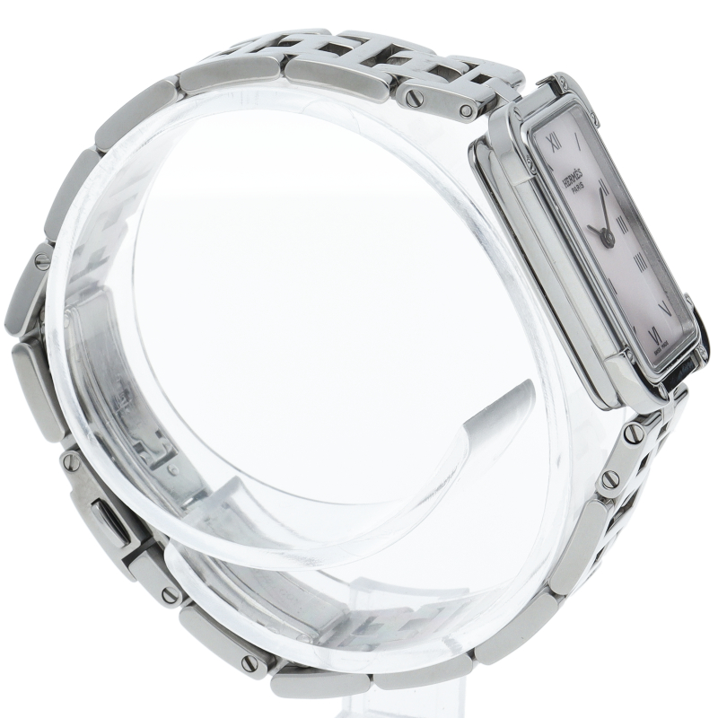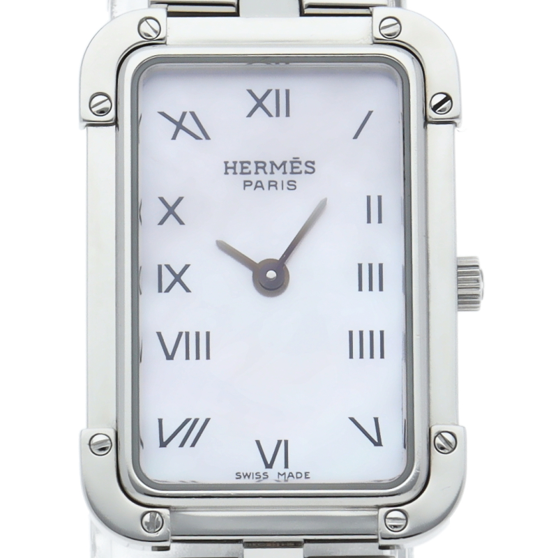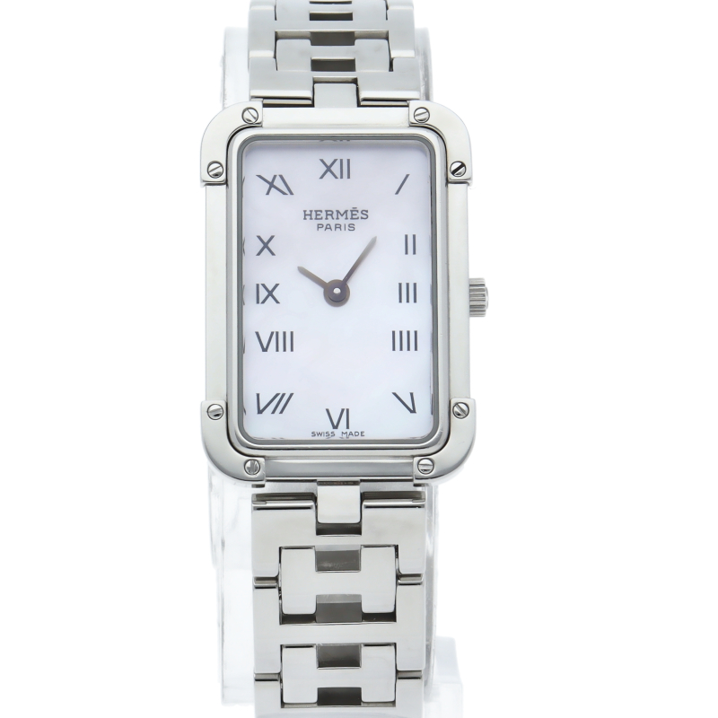 エルメスの細長いケースにHのブレスが特徴的なレディース時計です。文字盤にはホワイトシェルを使用してシャープで出来る女性を演出してくれます。