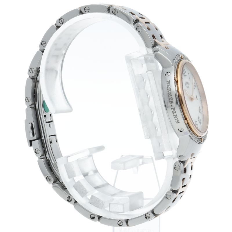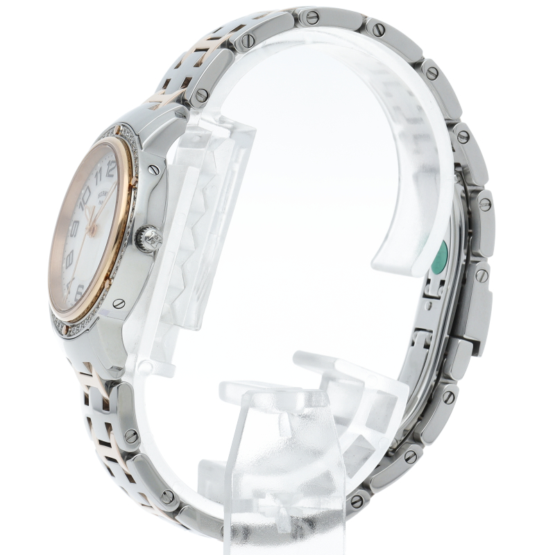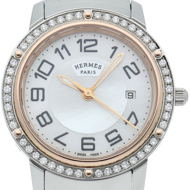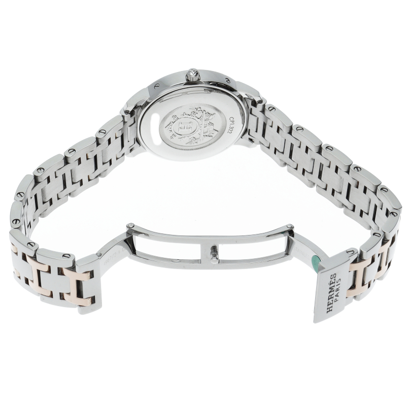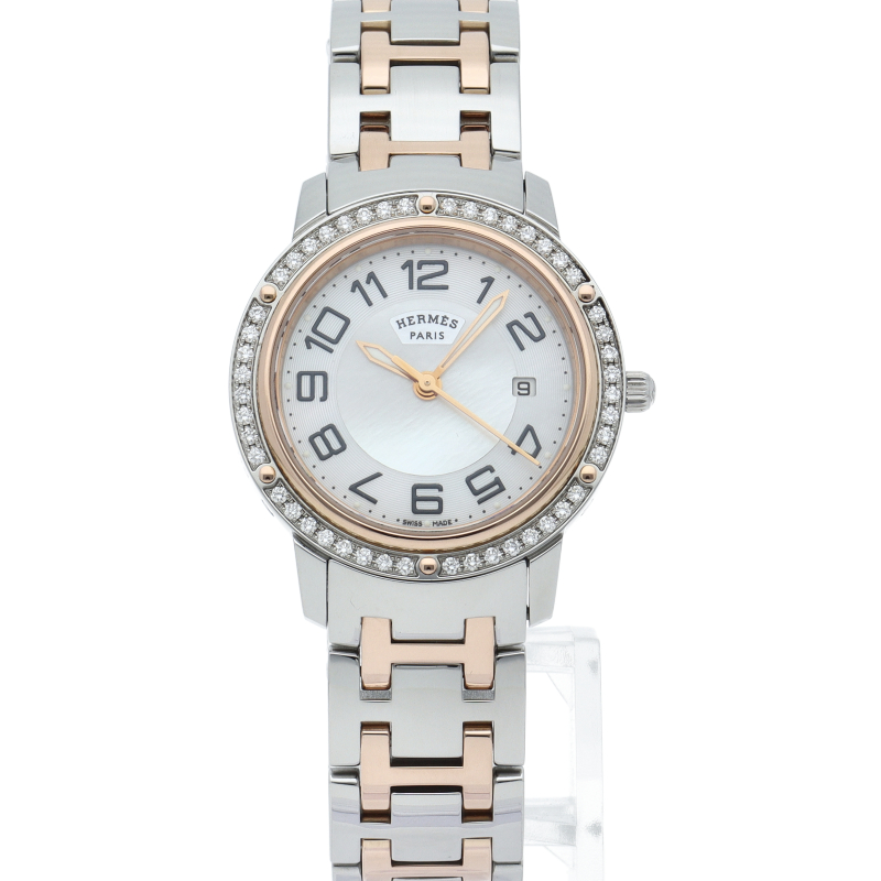 エルメスの時計シリーズの中でも非常にポピュラーな「クリッパー」。以前のモデルと比較すると、ブレスレットと文字盤のデザインが変更されており、ブレスレットは、コマとコマの間の隙間が無くなり、重厚感のある印象になっています。また、文字盤は中央にサークルの模様が入っているデザインになっています。