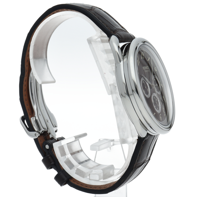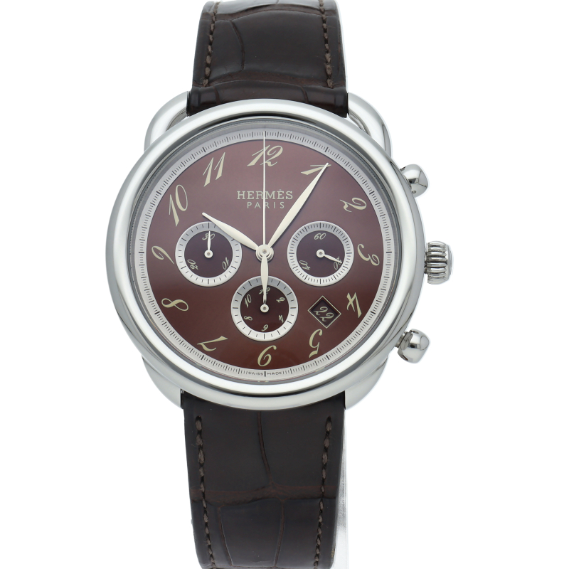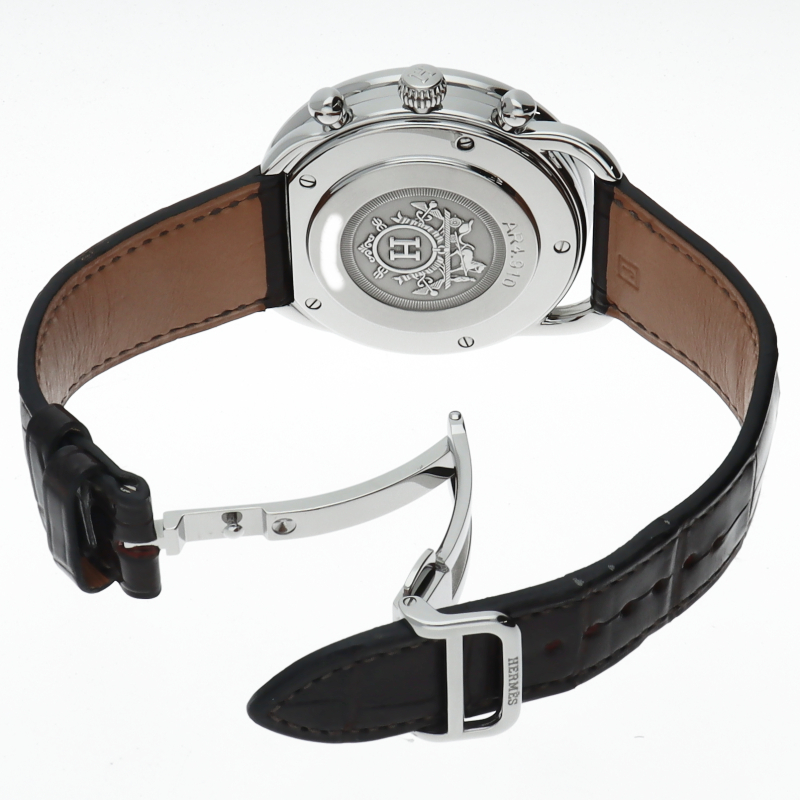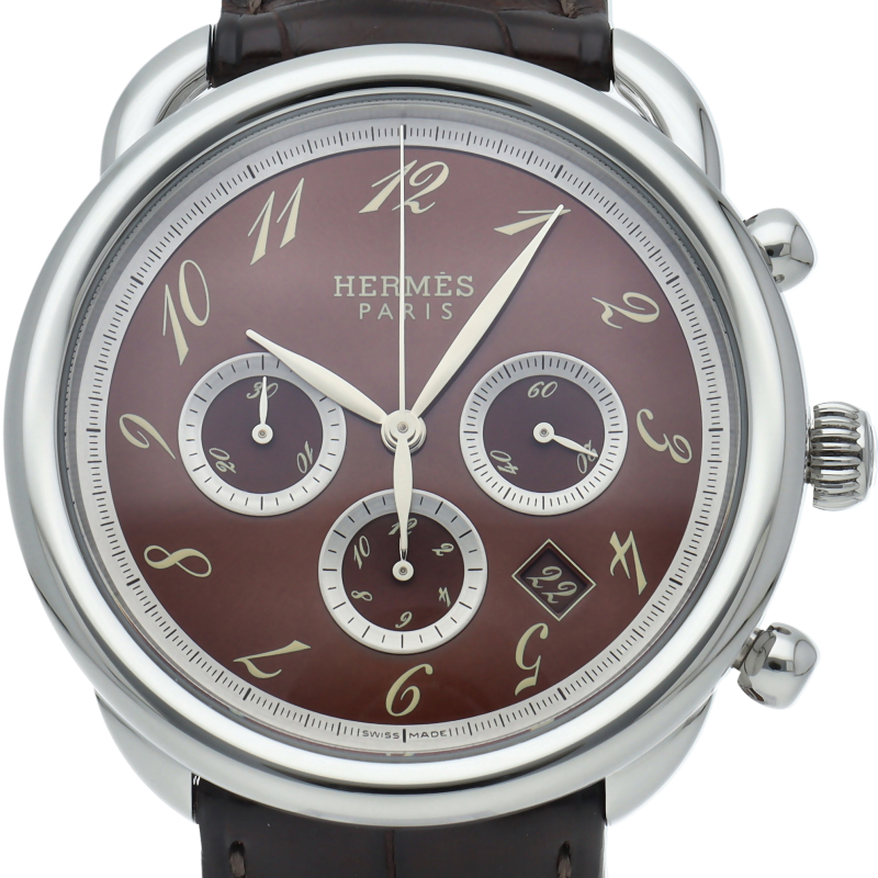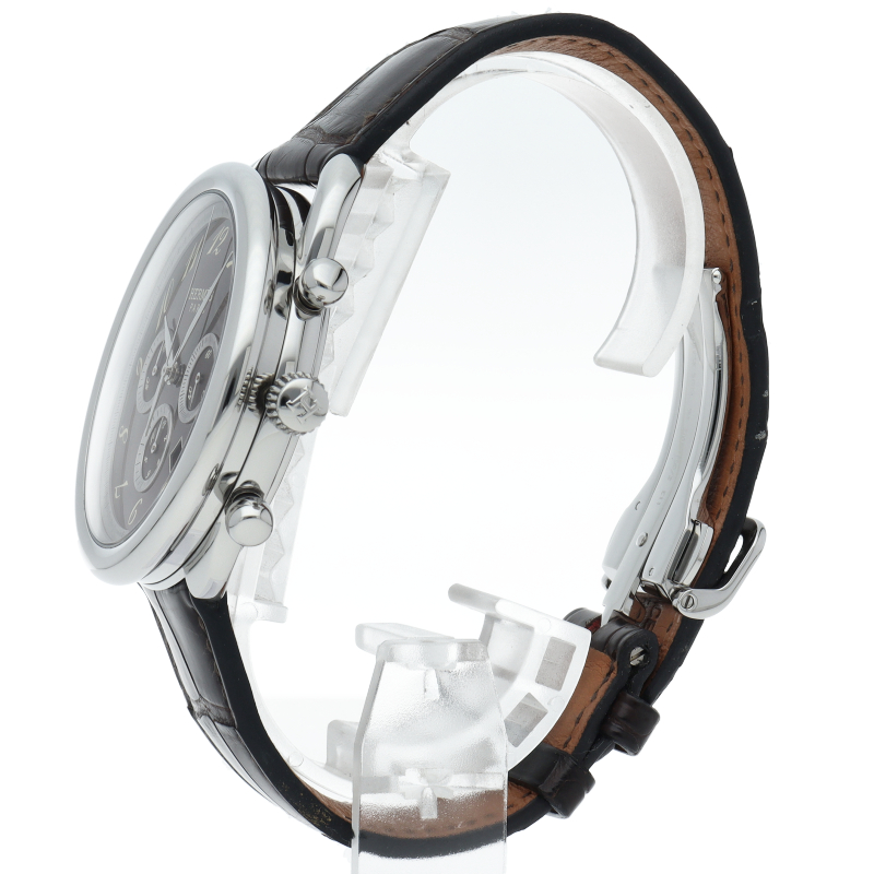 実用性の高いクロノグラフ機能、カレンダー機能を搭載。アルソーはラウンドケースに斜体のアラビアインデックス、乗馬の際に足をかける「あぶみ」のようなデザインのラグが特徴です。クロノグラフ機能搭載。□J刻印。