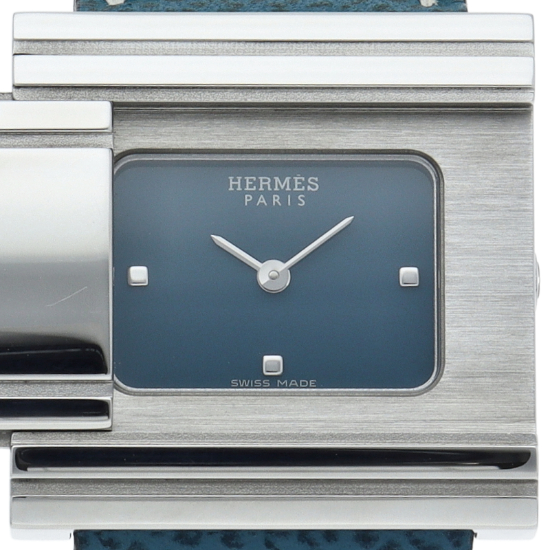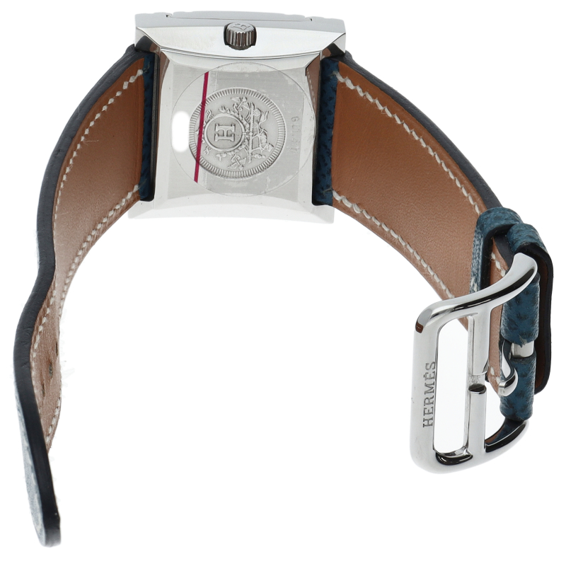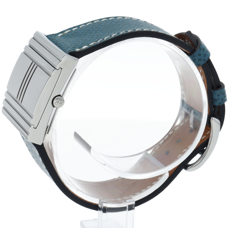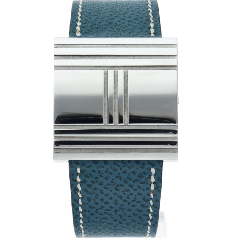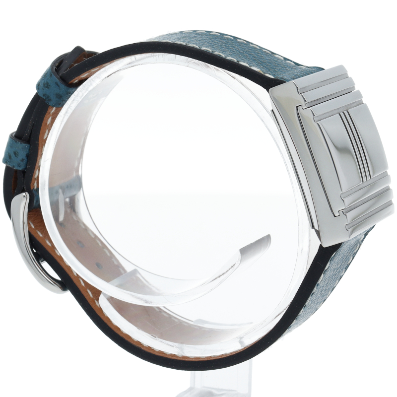 表面のカバーをスライドさせることで時計が現れる「グリザード」。カバーを開いていない状態で時計を横向きに見ると、大きな「H」の文字が彫られているエルメスらしいデザインのモデルです。□G刻印。