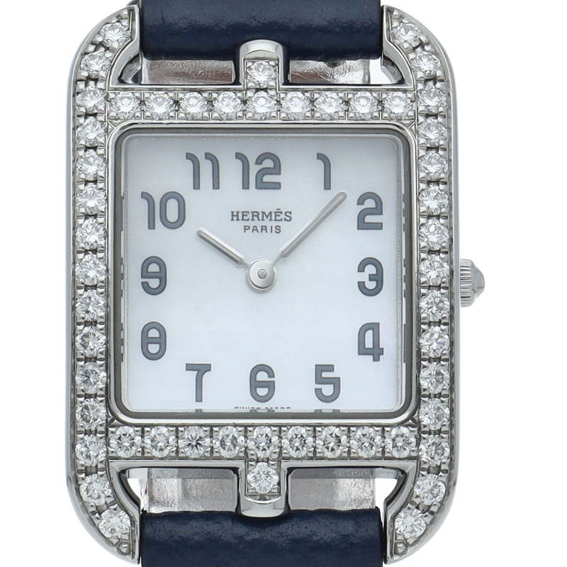 エルメスの時計シリーズの中でも安定した人気を誇る「ケープコッド」。シンプルなデザインながら上品な雰囲気が漂う1本。ベゼルにはダイヤと文字盤にはシェルを使用した逸品です。