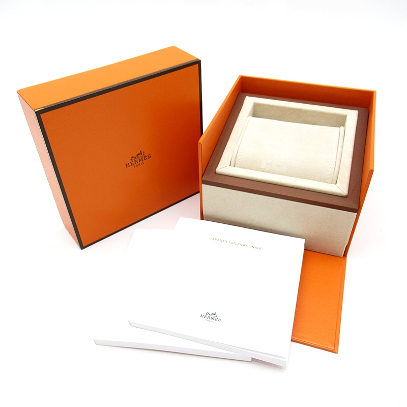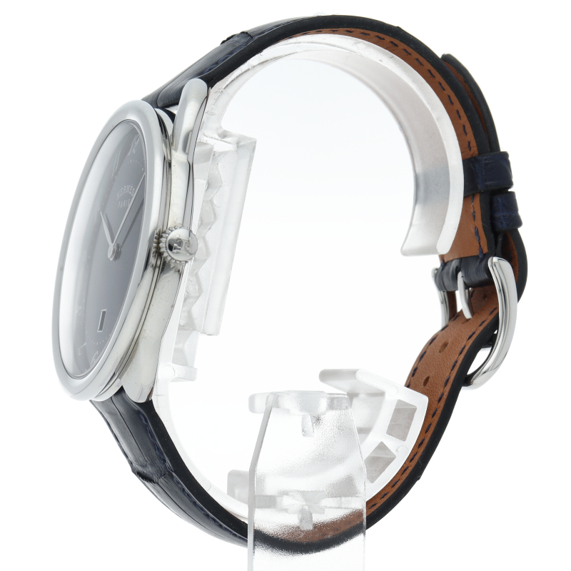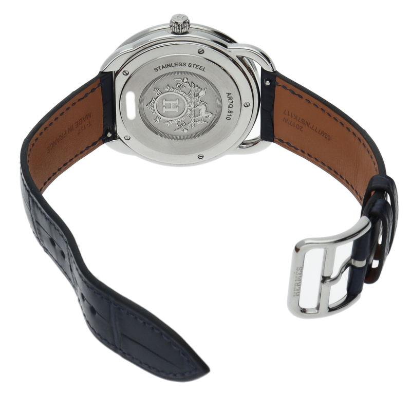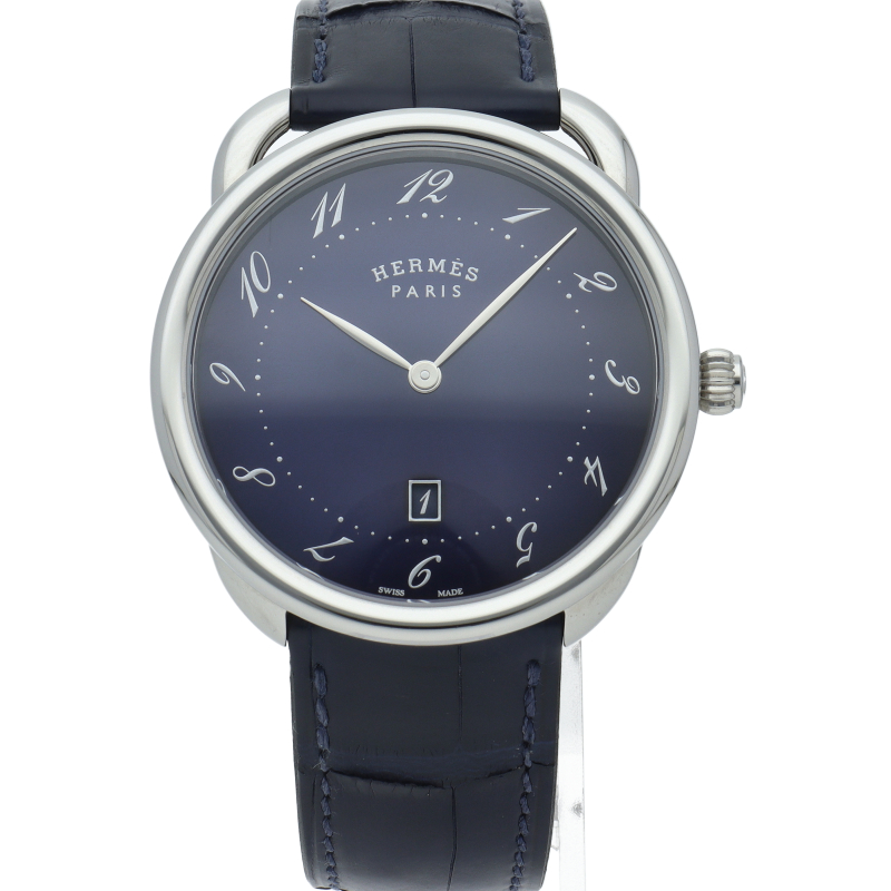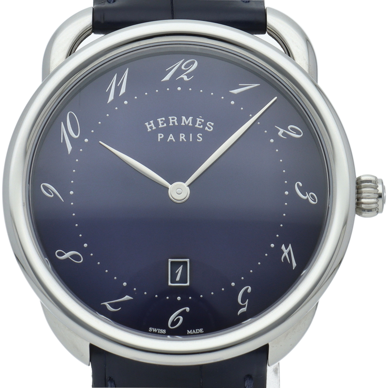 エルメス時計の始まりであるアルソーは、ARCEAU「鐙(あぶみ)」という意味。流れるようなアラビアインデックスが特徴的なシリーズです。こちらはブルーダイアルにリーフの2針+デイト窓のシンプルで飽きの来ないクラシカルなモデルです。