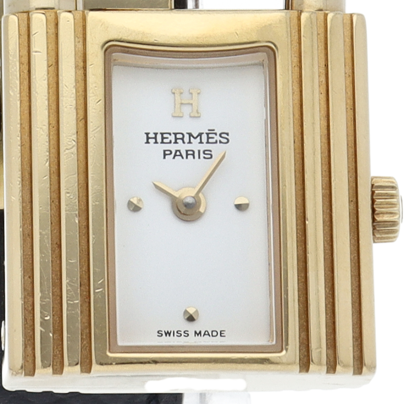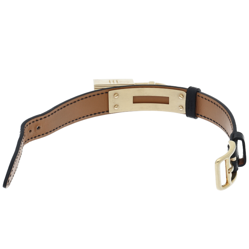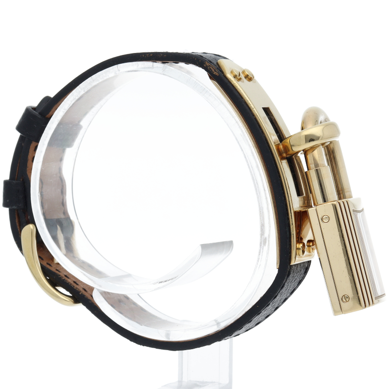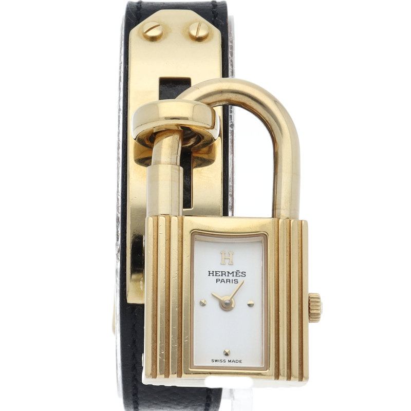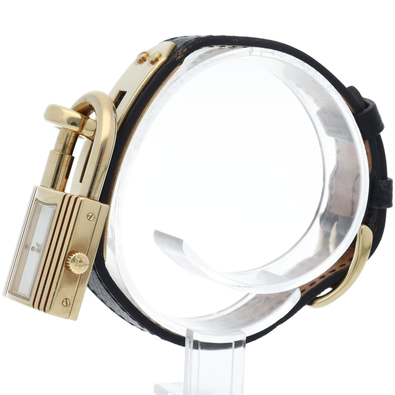 南京錠モチーフが可愛らしい、エルメスのケリーウォッチです。エルメスならではの優美な雰囲気を漂わせたアクセサリー感覚でお使いいただける1本。□D刻印。