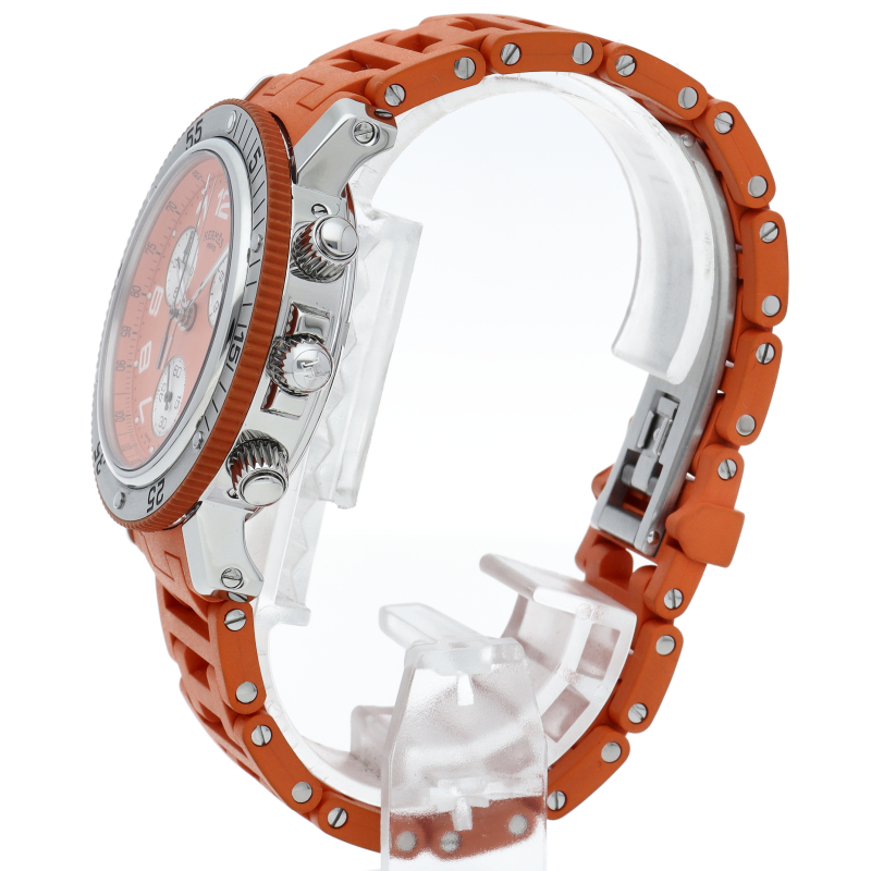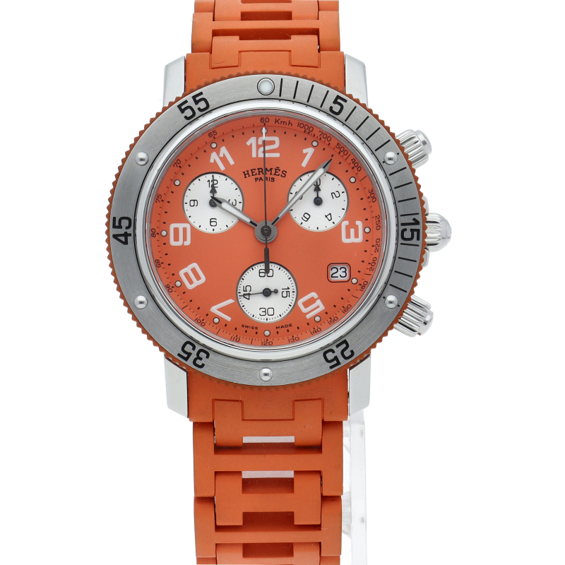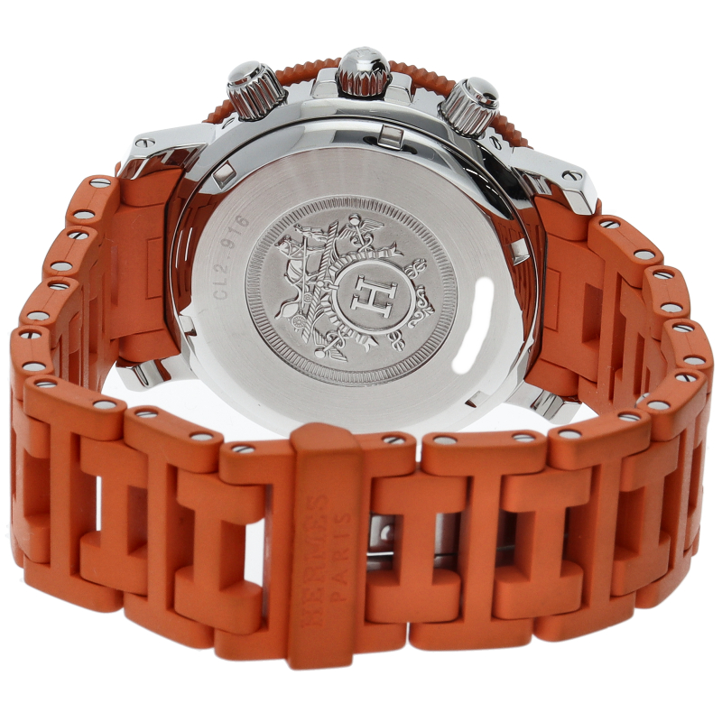 エルメスの時計シリーズの中でも非常にポピュラーな「クリッパー」。「H」ロゴを特徴としたブレスに上品で落ち着いたデザインが特徴です。クロノグラフ機能付。
