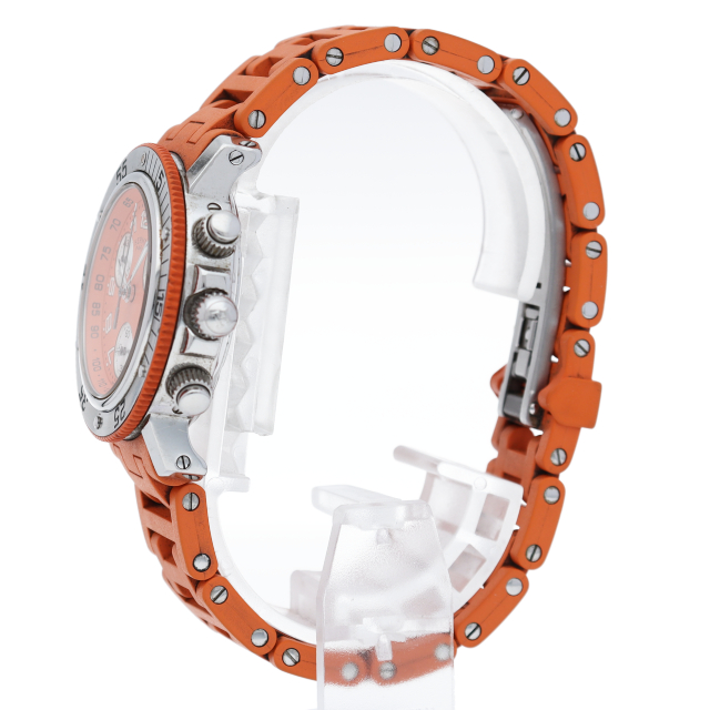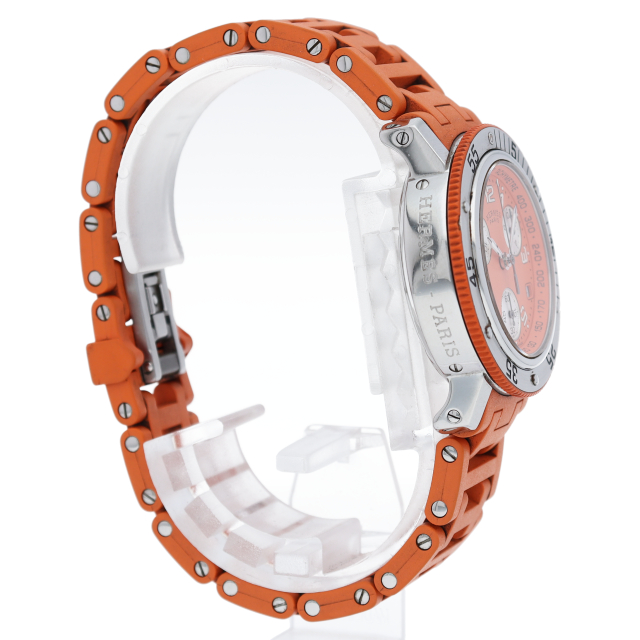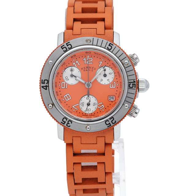 エルメスの時計シリーズの中でも非常にポピュラーな「クリッパー」。100m防水にストップウォッチ機能を兼ね備えており、デザインだけではなく、機能も充実したモデルです。エルメスのブランドカラーである「オレンジ」が印象的なモデルです。