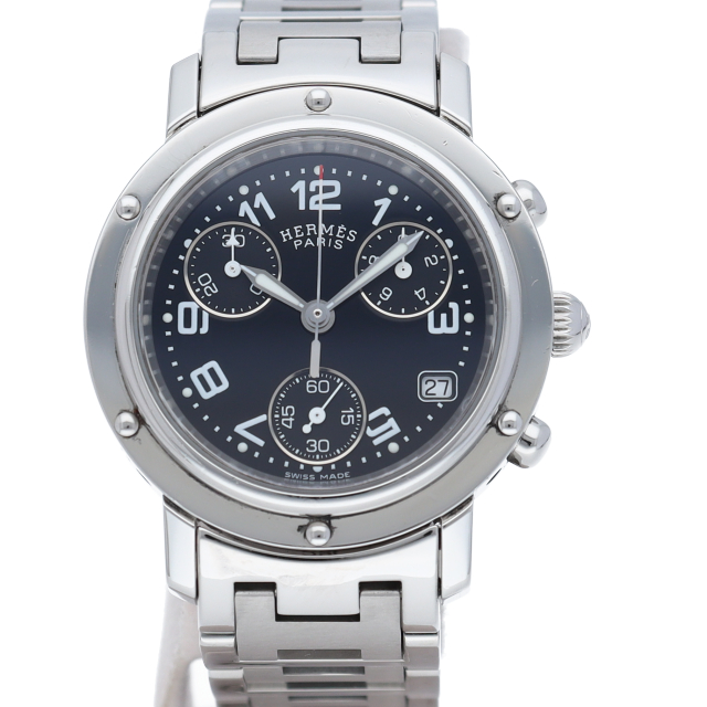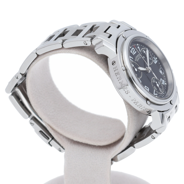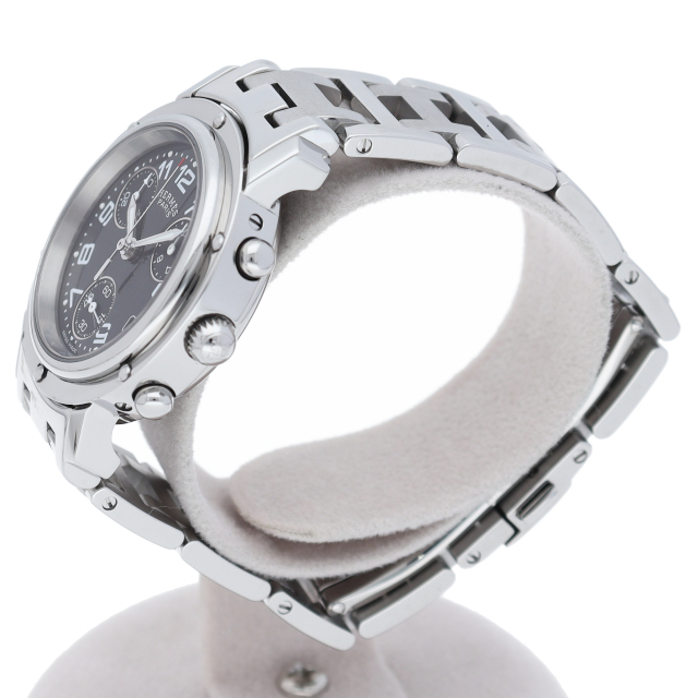 エルメスの時計シリーズの中でも非常にポピュラーな「クリッパー」。「H」ロゴを特徴としたブレスに上品で落ち着いたデザインが大人の雰囲気を演出します。クロノグラフ機能付。