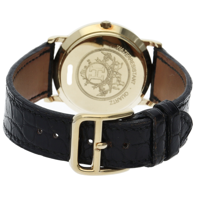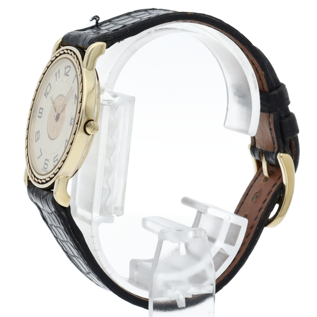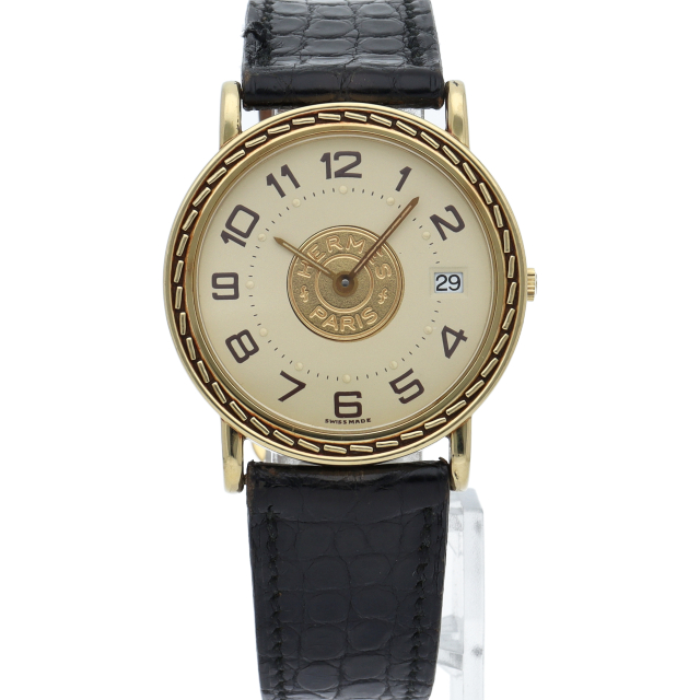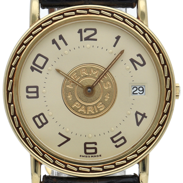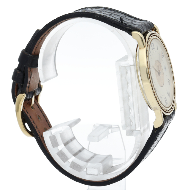ベゼルにステッチ模様を配し、文字盤中央にセリエコインを施したこの時計は、エルメスらしい上品さと繊細さを併せ持った非常に優雅な逸品です。◯T刻印。