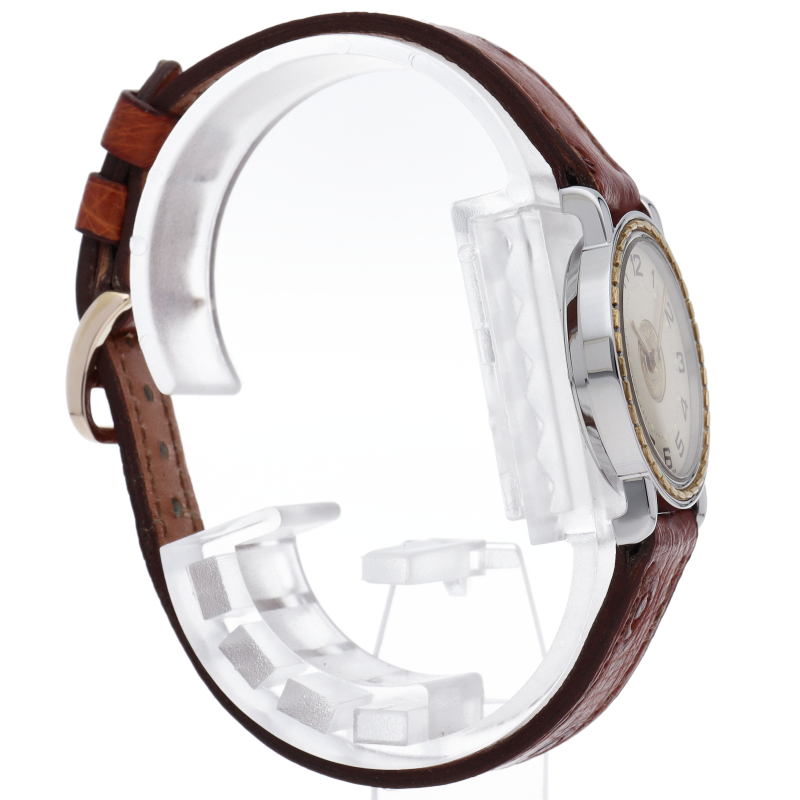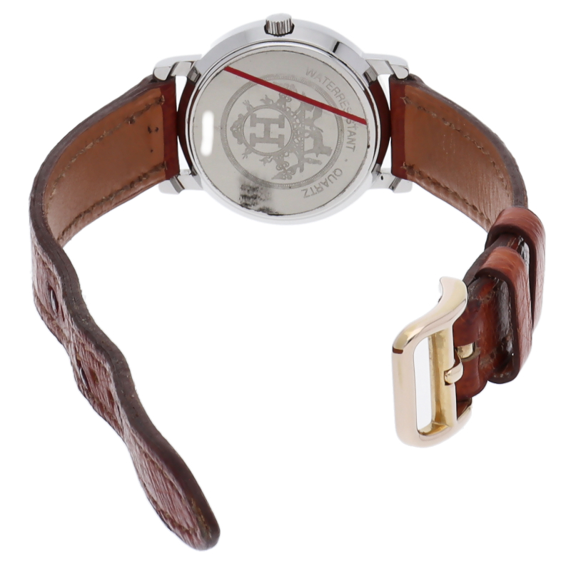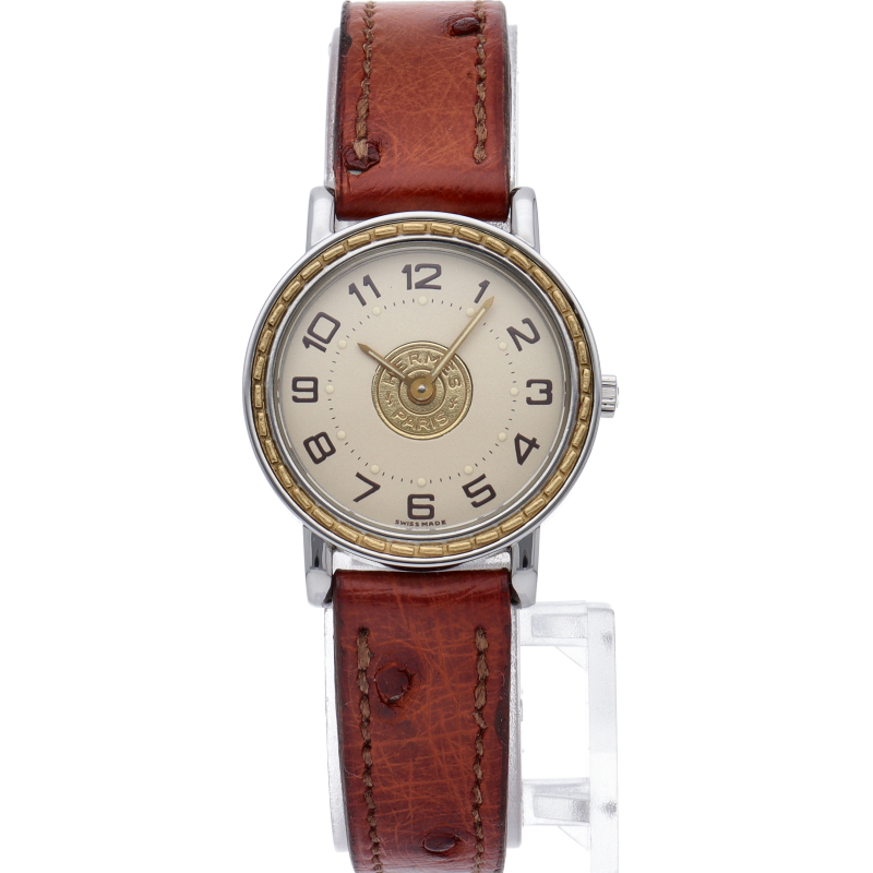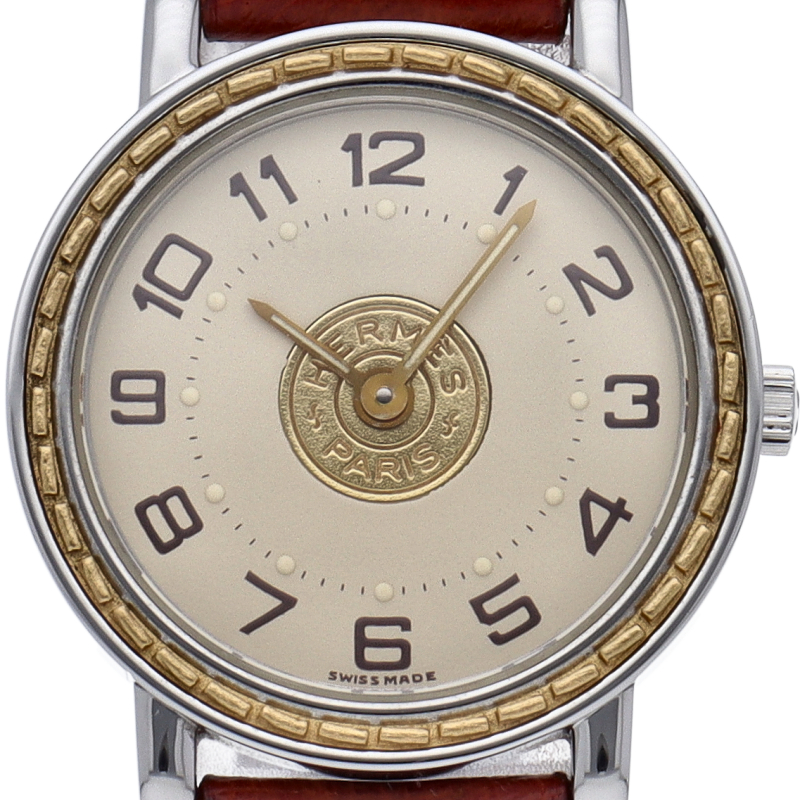 ベゼルにステッチ模様を配し、文字盤中央にセリエコインを施したこの時計は、エルメスらしい上品さと繊細さを併せ持った非常に優雅な逸品です。◯R刻印。