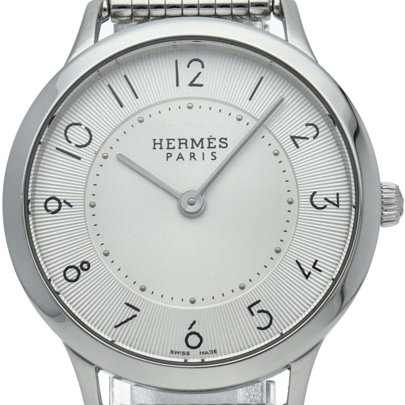 エルメスからシンプルなデザインが人気の『スリム ドゥ エルメス』です。ダイヤルは、現代のフランスを代表するグラフィックデザイナー「フィリップ・アペロワ」によりデザインされたものです。全体的に落ち着いた印象で、コーディネートを問わずにお使いいただけます。 シンプルですが上品なデザインです。
