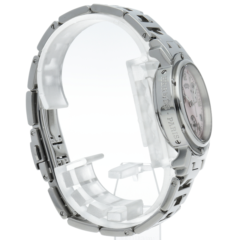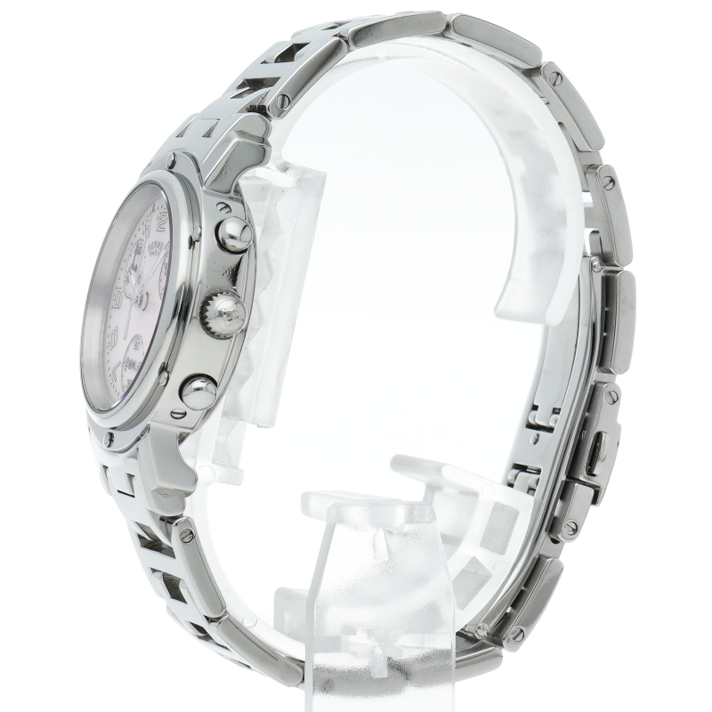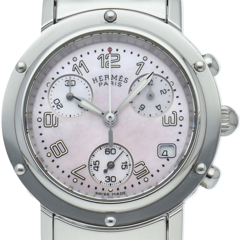 エルメスの時計シリーズの中でも非常にポピュラーな「クリッパー」。「H」ロゴを特徴としたブレスで、クロノグラフ機能付。シェル文字盤。