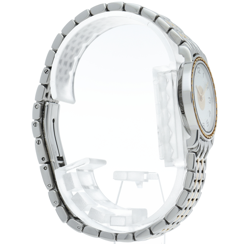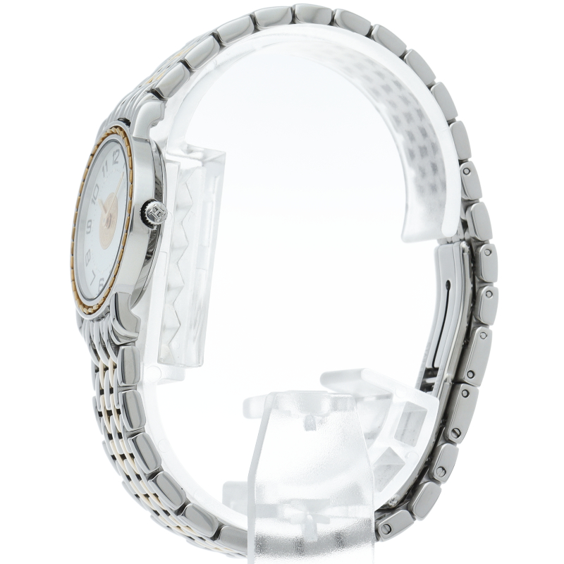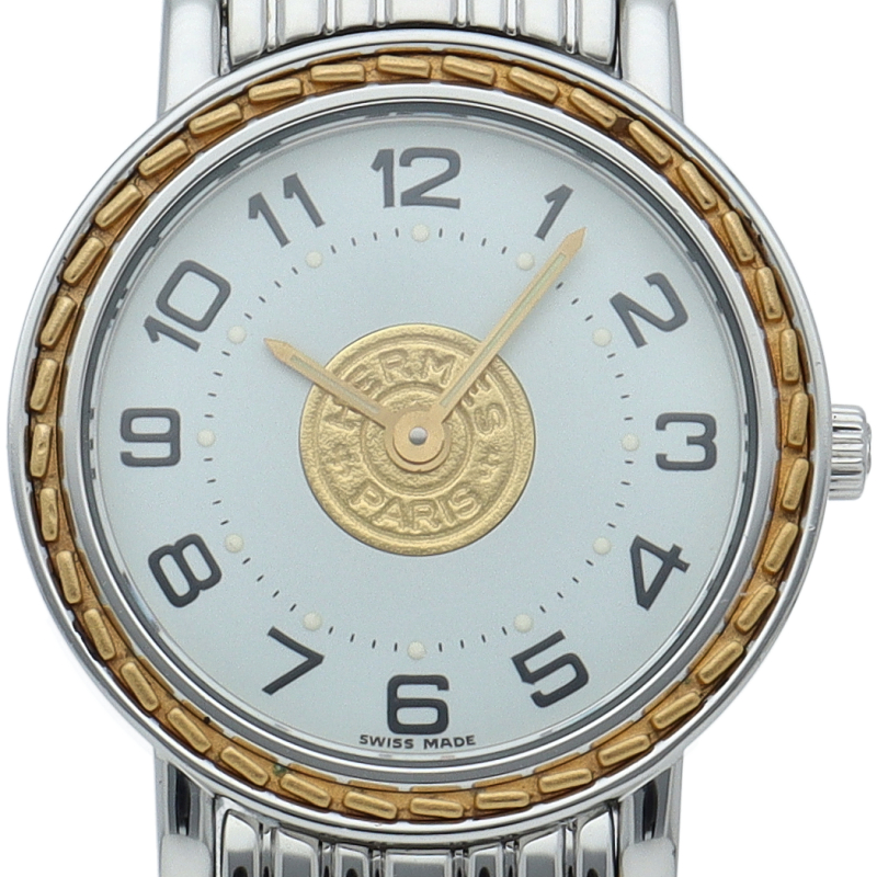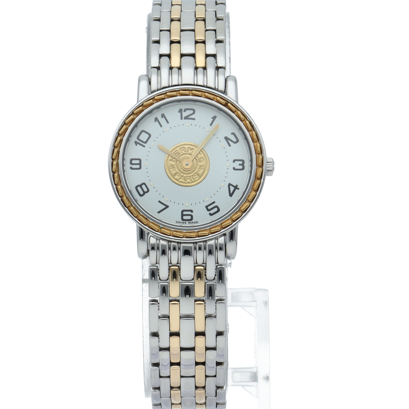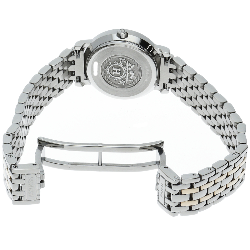 ベゼルにステッチ模様を配し、文字盤中央にセリエコインを施したこの時計は、エルメスらしい上品さと繊細さを併せ持った非常に優雅な逸品です。