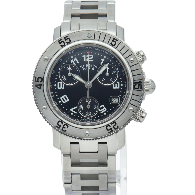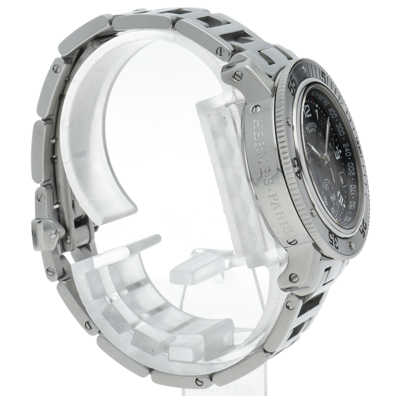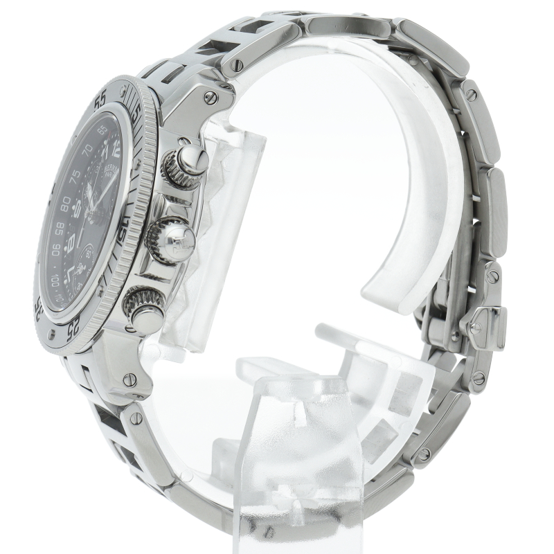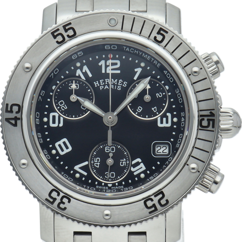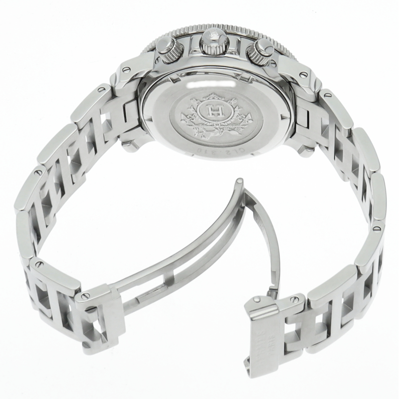 エルメスの時計シリーズの中でも非常にポピュラーな「クリッパー」。「H」ロゴを特徴としたブレスに逆回転ベゼルが装備されスポーティな印象の腕時計です。クロノグラフ機能付。