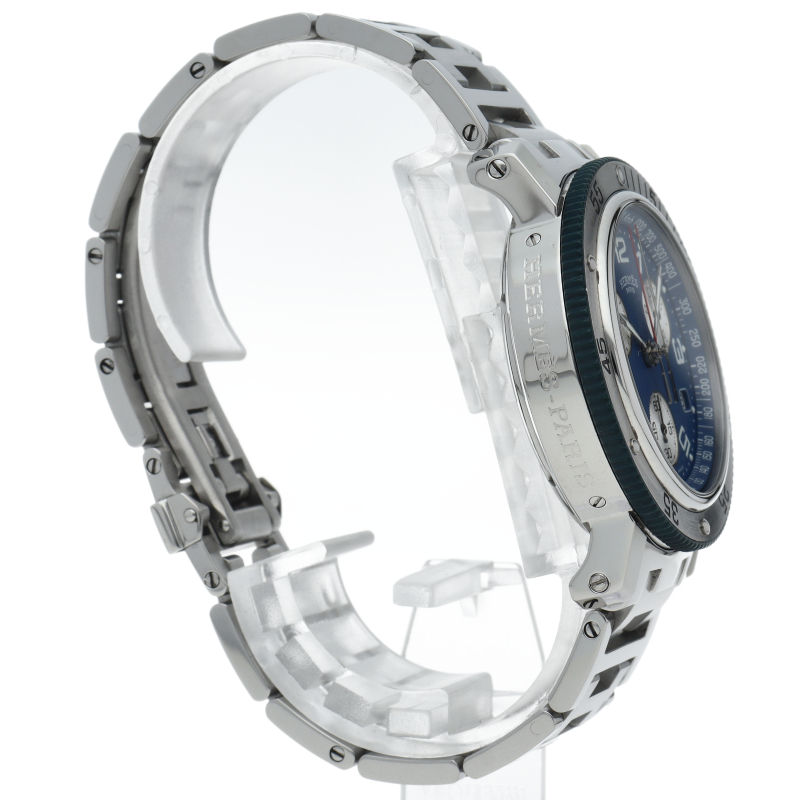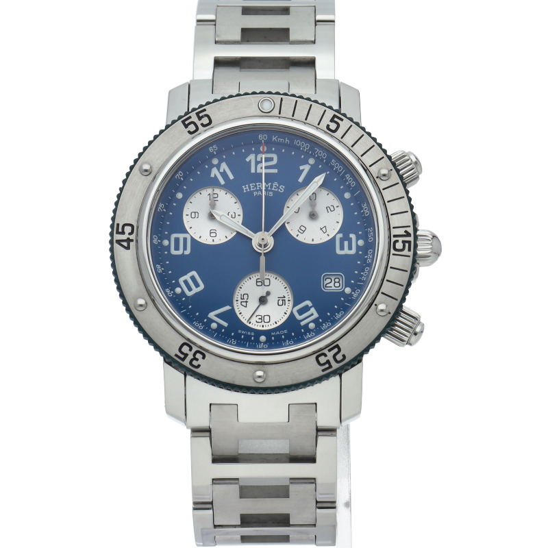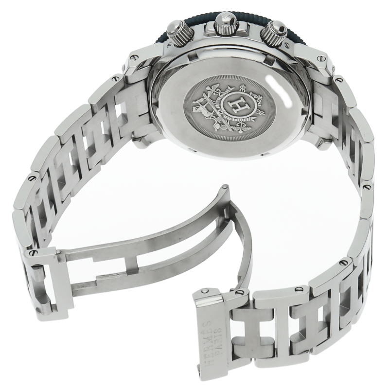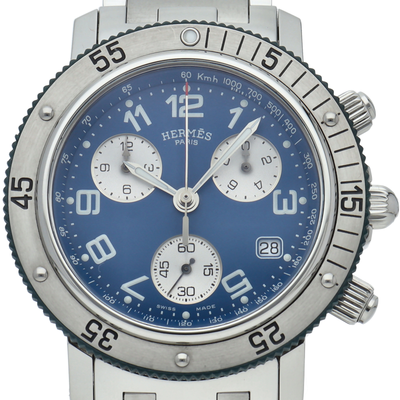 エルメスの時計シリーズの中でも非常にポピュラーな「クリッパー」。「H」ロゴを特徴としたブレスに逆回転ベゼルが装備されスポーティな印象の腕時計です。クロノグラフ機能付。