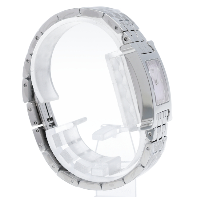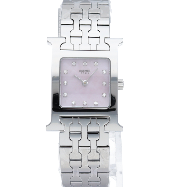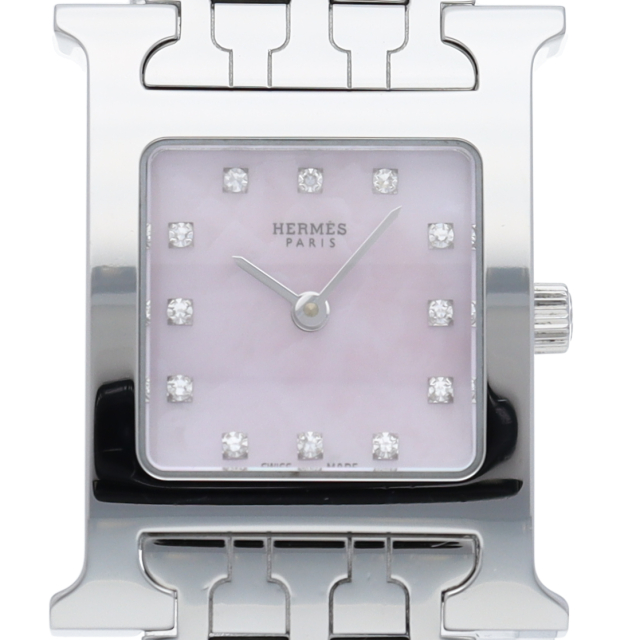 エルメスの人気モデル「Hウォッチ」。エルメスの頭文字である「H」をモチーフに作られたシンプルでオーソドックスな1本。文字盤はピンクシェルが使われ、12ポイントダイヤモンドと共に上品さを表しています。