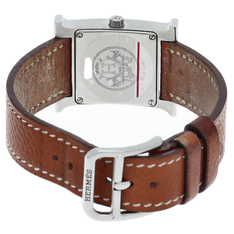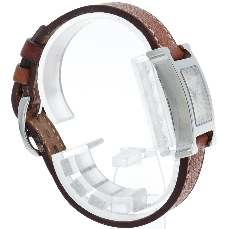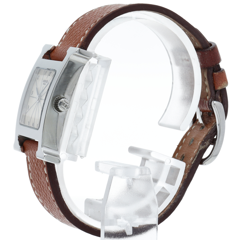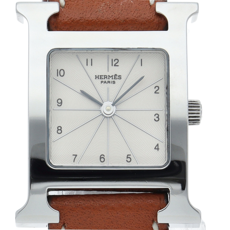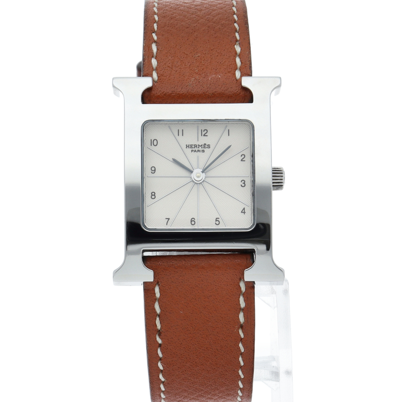 エルメスの人気モデル「Hウォッチ」。エルメスの頭文字である「H」をモチーフに作られたシンプルでオーソドックスな1本。□H刻印。