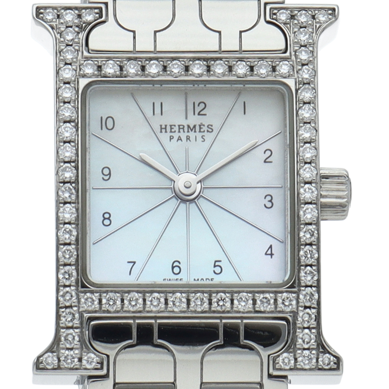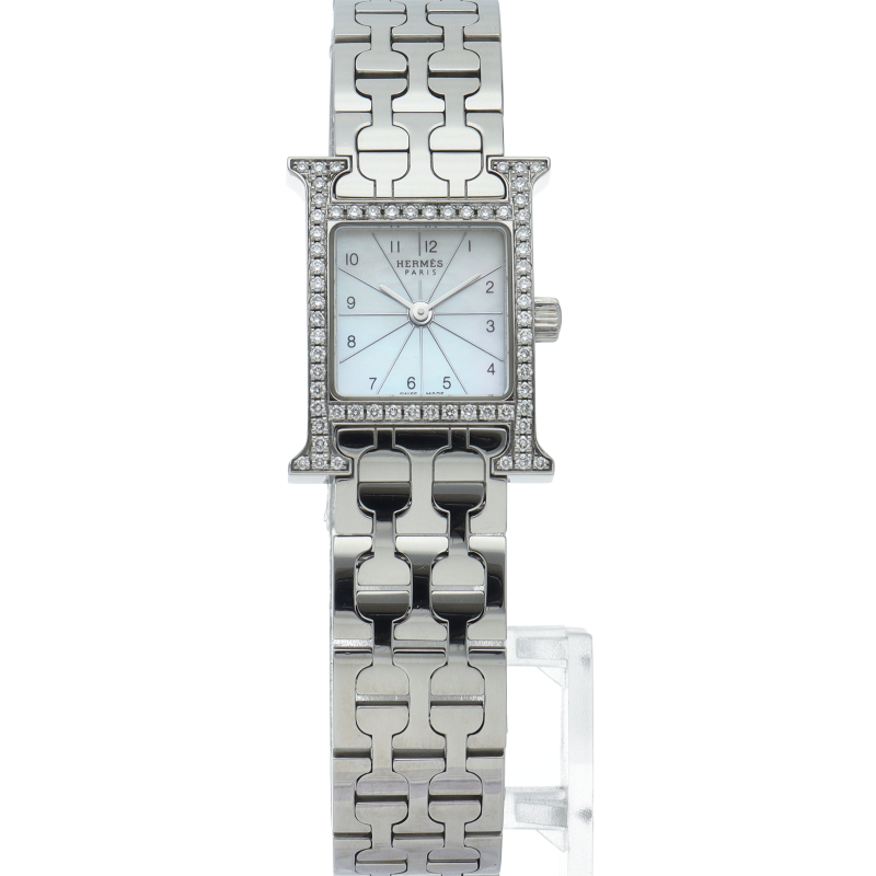 エルメスの頭文字である“H”をモチーフにしてデザインされた“Hウォッチ”。 ケースは腕にフィットするよう緩やかなカーブを描いており、着け心地は抜群です。ベゼルにダイヤモンドを贅沢に敷き詰め、エレガントで味わいのあるデザインに仕上がっています。
