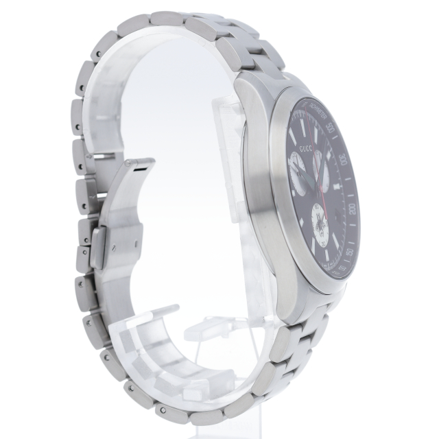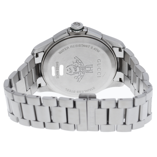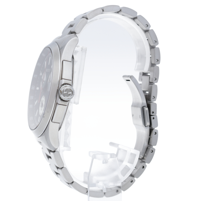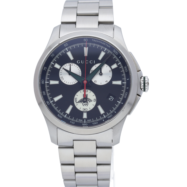 グッチの人気シリーズ「G-タイムレス」。都会的なデザインがオンオフ問わずご使用になれます。今、流行のケースサイズが大きい一本です。