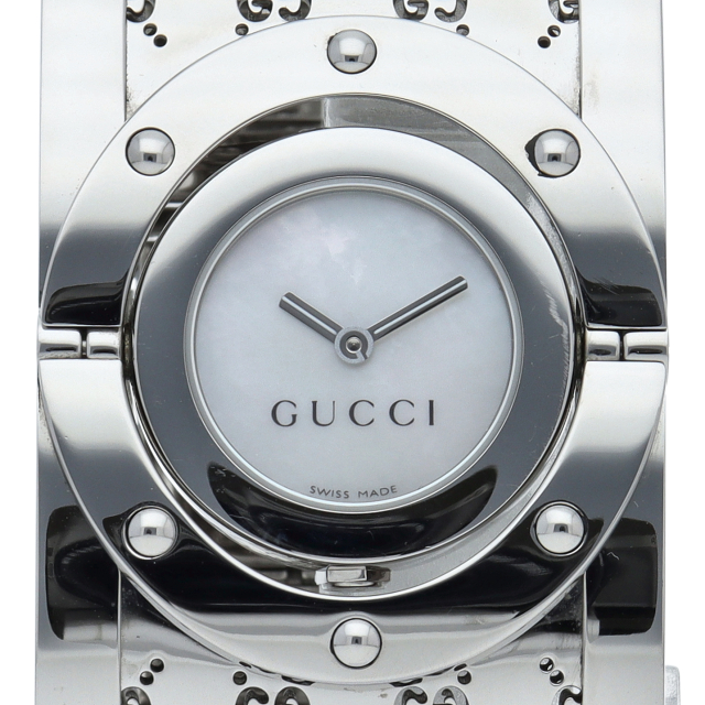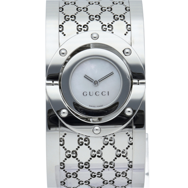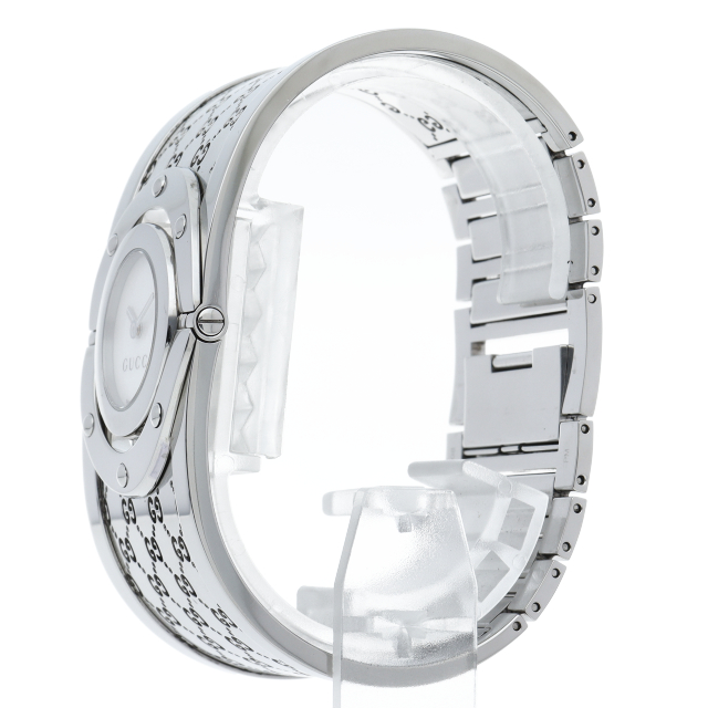 GGロゴが満遍なくちりばめられたバングルに、時計部分をくるりと回転させるとフェイスが内側に隠れGG柄が刻印された裏蓋が顔を出します。幅広のバングルはブレスレット感覚で着けることができるお洒落なシリーズです。YA112413(112)
