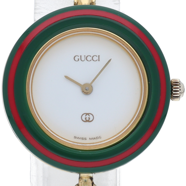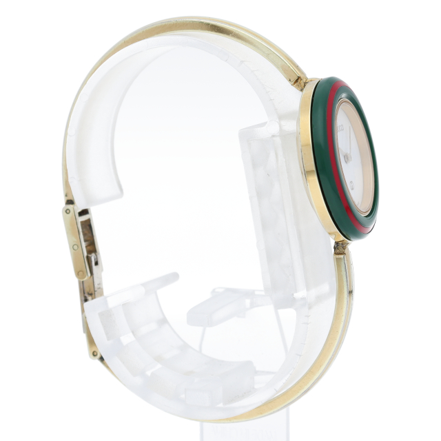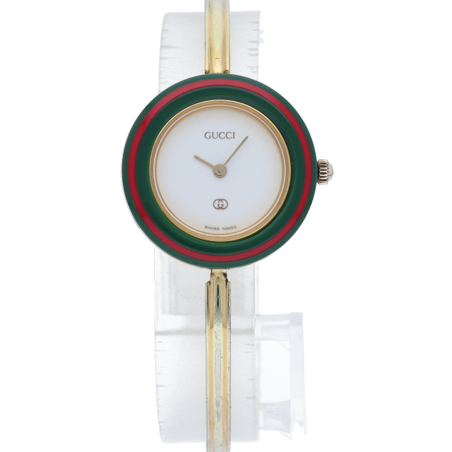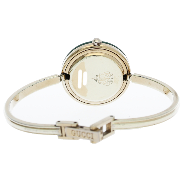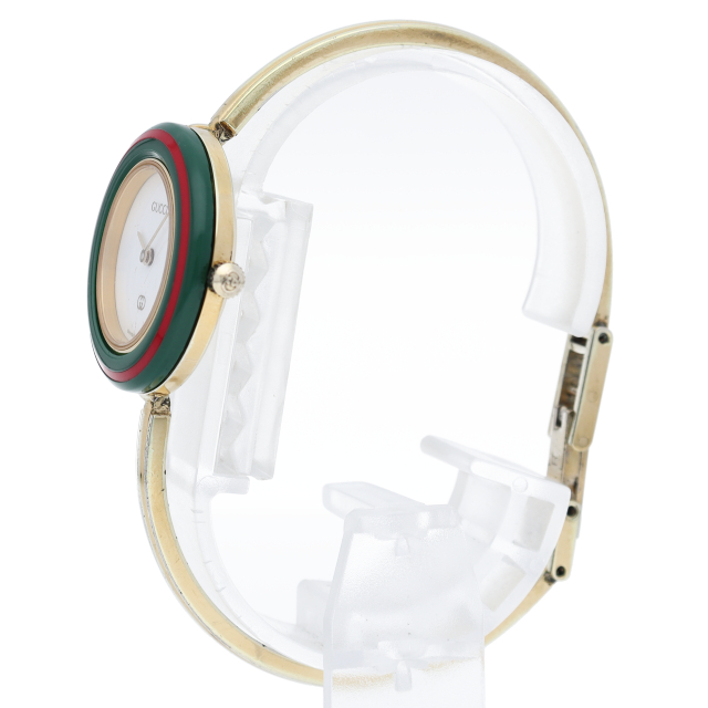すっきりとしたフェイスにGUCCIの文字がさりげなく刻まれ、ブレスレット感覚で着用出来る時計です。