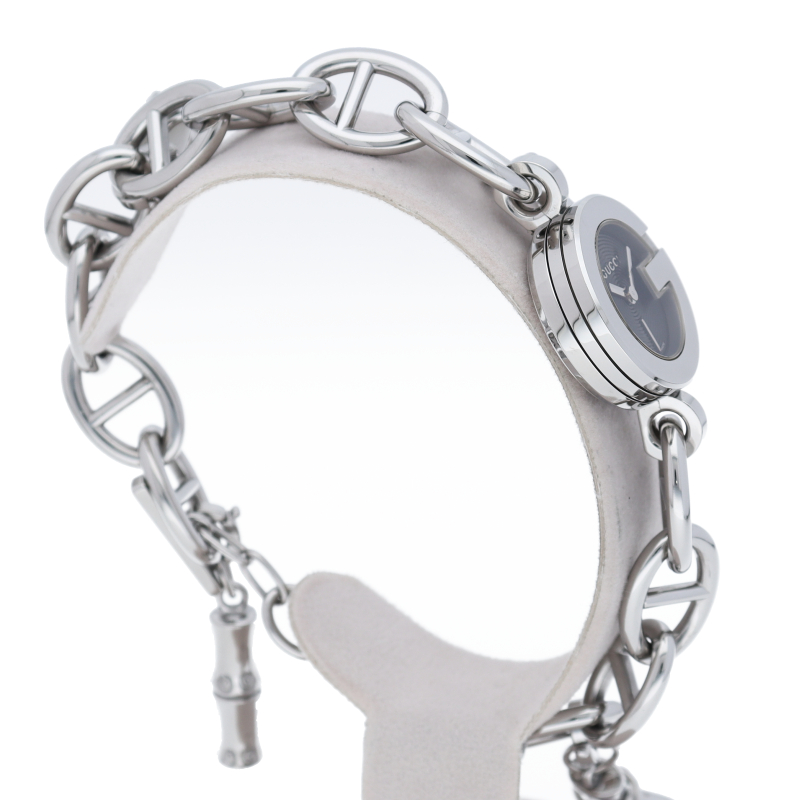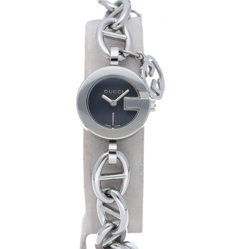 すっきりとしたフェイスにGUCCIの文字がさりげなく刻まれ、ブレスレット感覚で着用出来る時計です。107(YA107503)