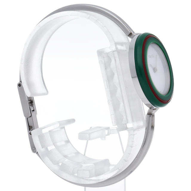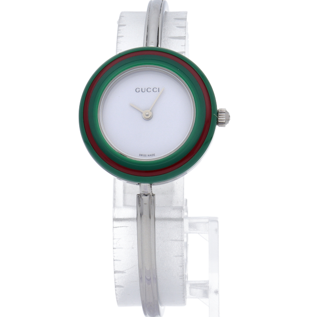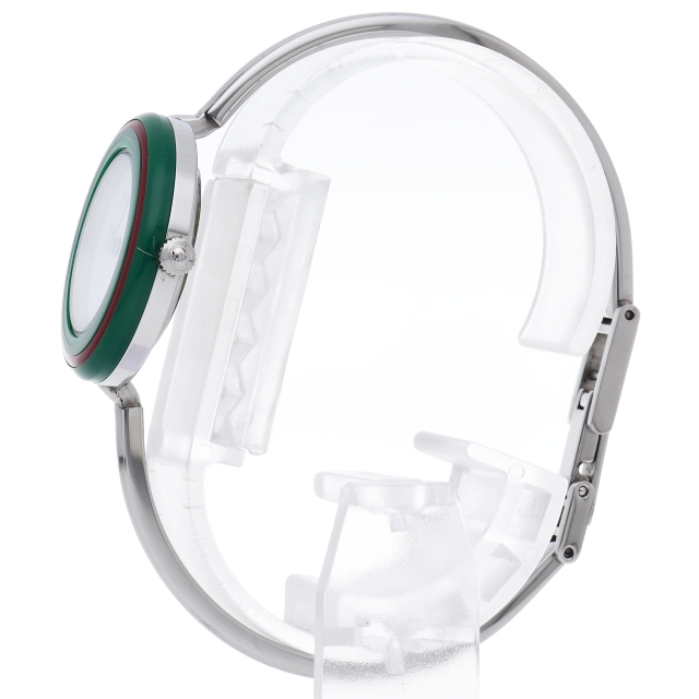 すっきりとしたフェイスにGUCCIの文字がさりげなく刻まれ、ブレスレット感覚で着用出来る時計です。