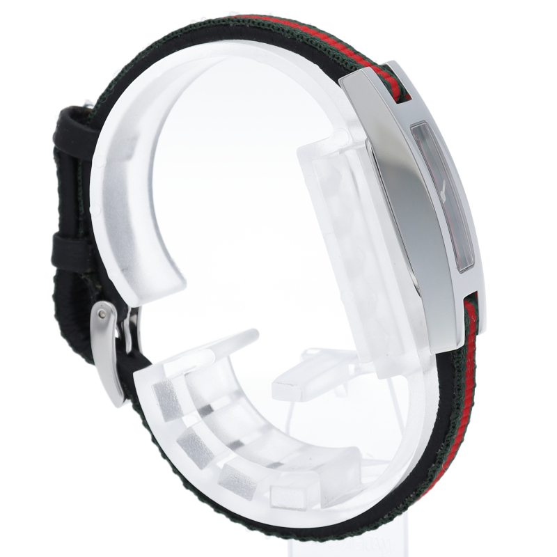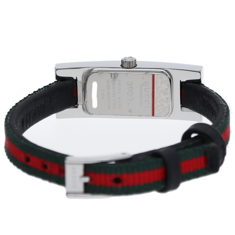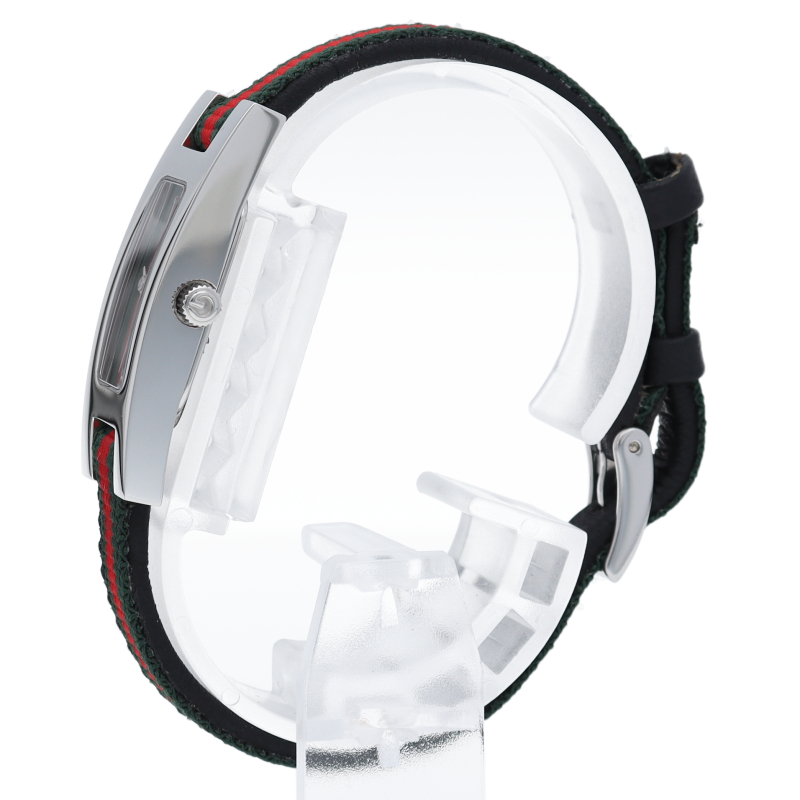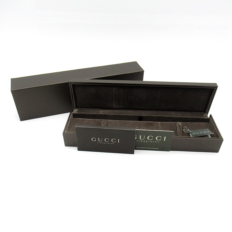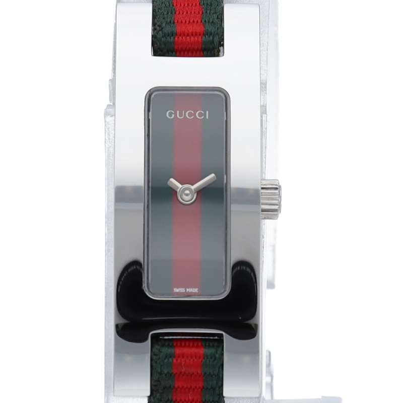 すっきりとしたフェイスにGUCCIの文字がさりげなく刻まれ、ブレスレット感覚で着用できる時計です。