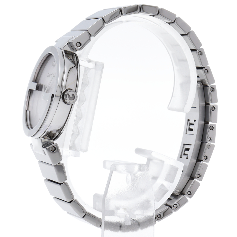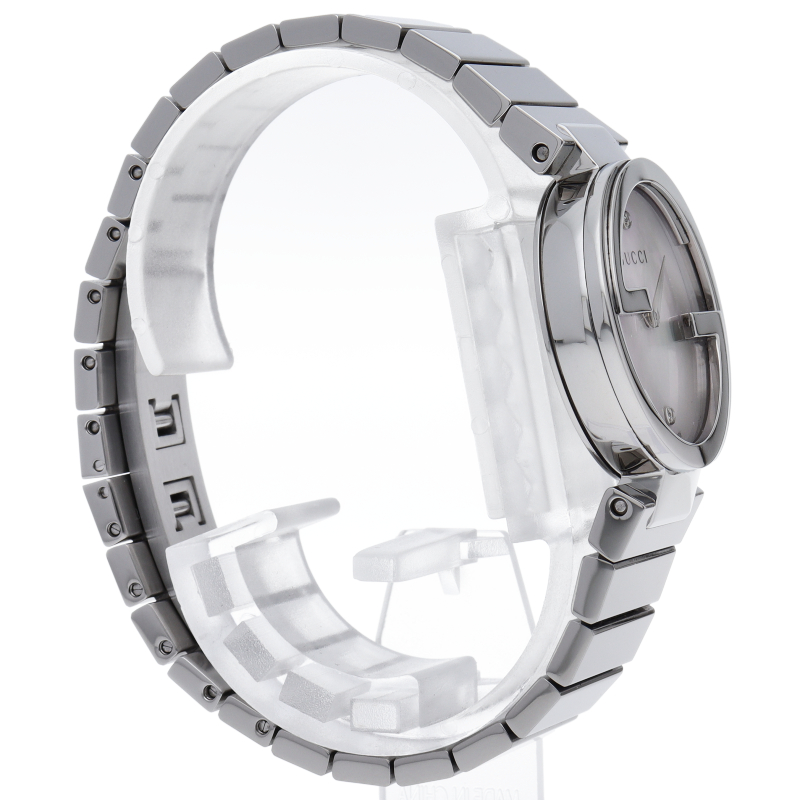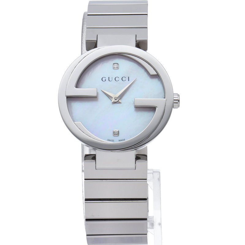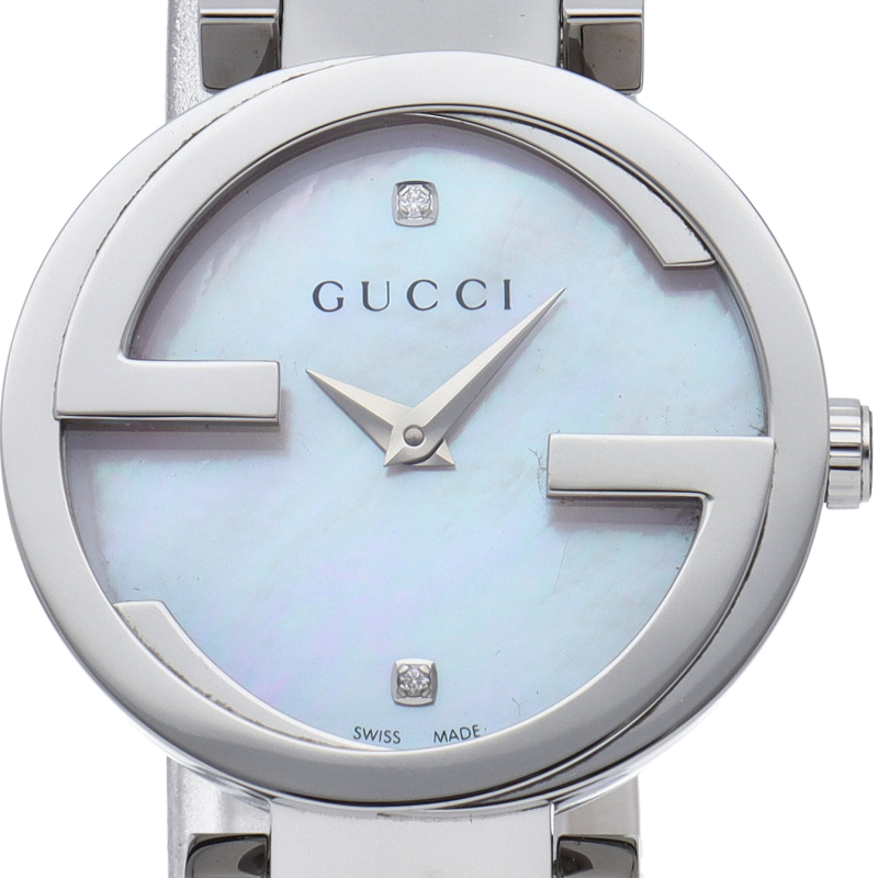 GGマークのフェイスが印象的なレディスドレスウオッチです。文字盤には2Pダイヤとシェルが施されたワンランク上のモデル。