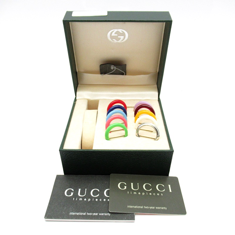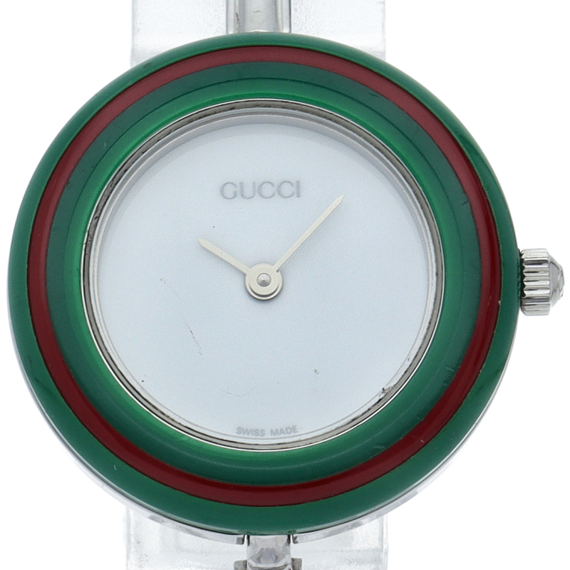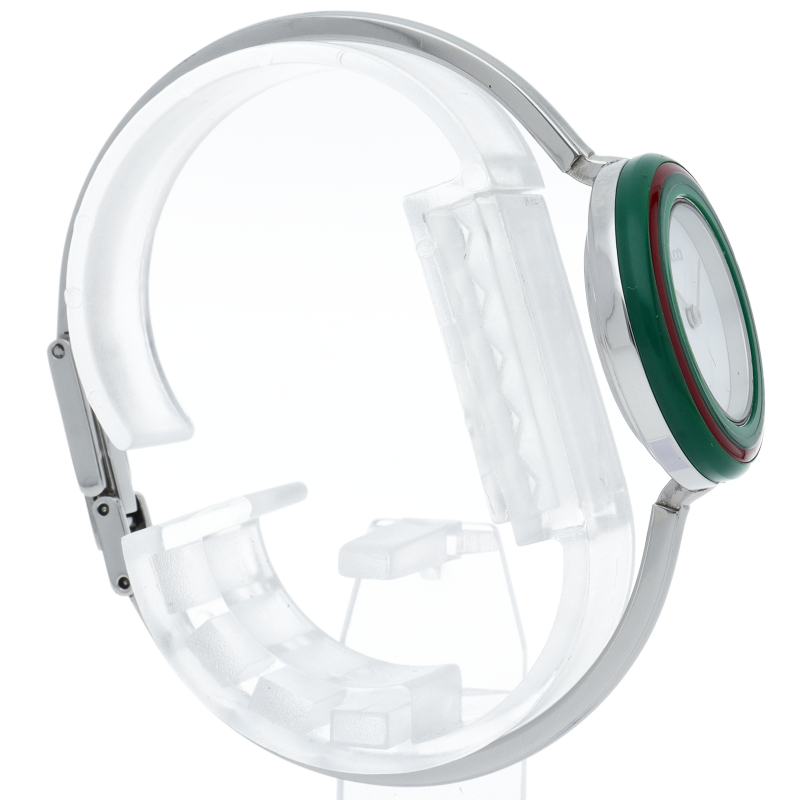 すっきりとしたフェイスにGUCCIの文字がさりげなく刻まれ、ブレスレット感覚で着用出来る時計です。