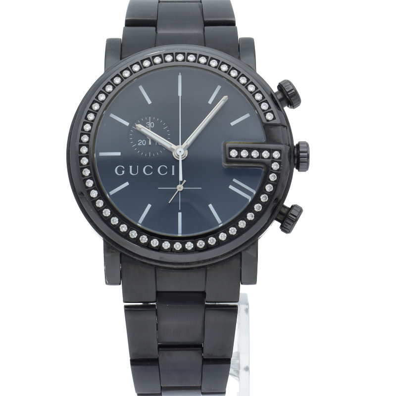 GUCCIのGを模ったケースは迫力のインパクト。10時位置に30分計を、6時位置にはスモールセコンドを設置。機能性だけでなく、存在感をアピールするモデルです。101M。