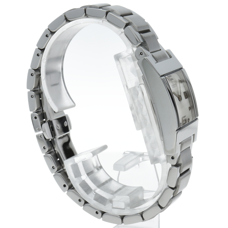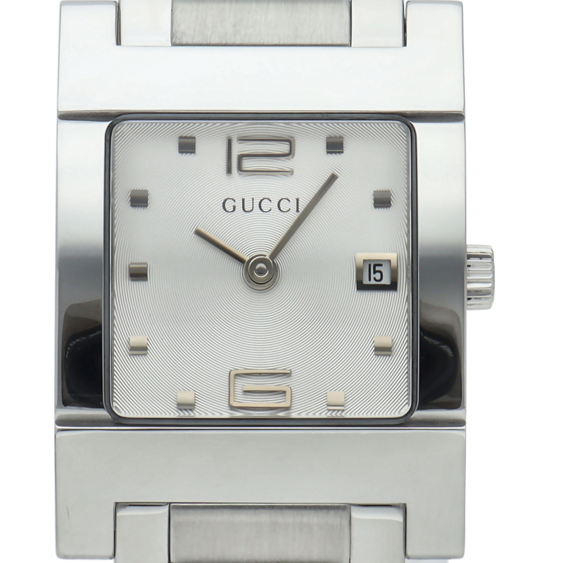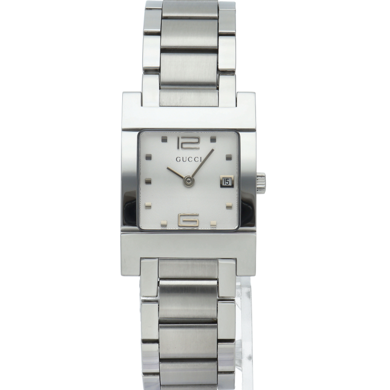 洗練されたデザインが光るグッチのスクエアフェイスウォッチ。スタイリッシュなスクエア型ケースと、シンプルでありながらも高級感漂う文字盤が特徴。美しいステンレススチールのブレスレットは、どんなコーディネートにもエレガントなアクセントを加えます。