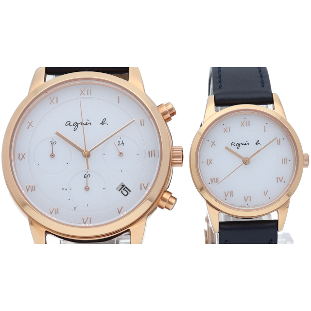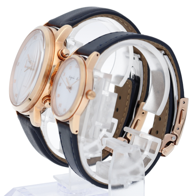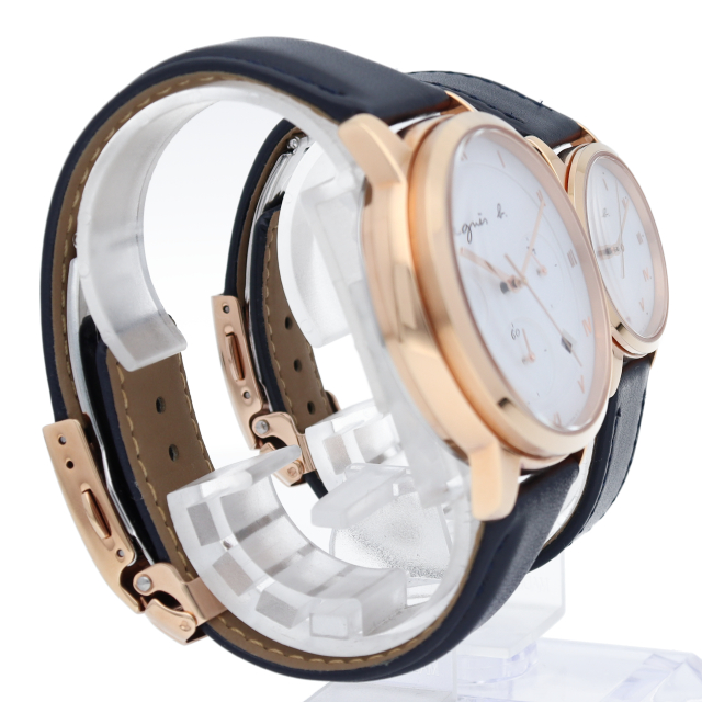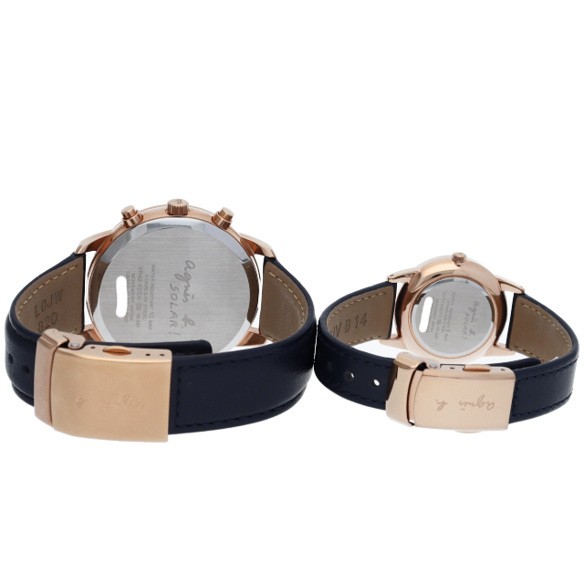 手書きのローマ数字がインデックスになったソーラーウォッチ。ピンクゴールド色のケースと紺色のカーフレザーバンドがエレガントな印象です。