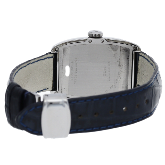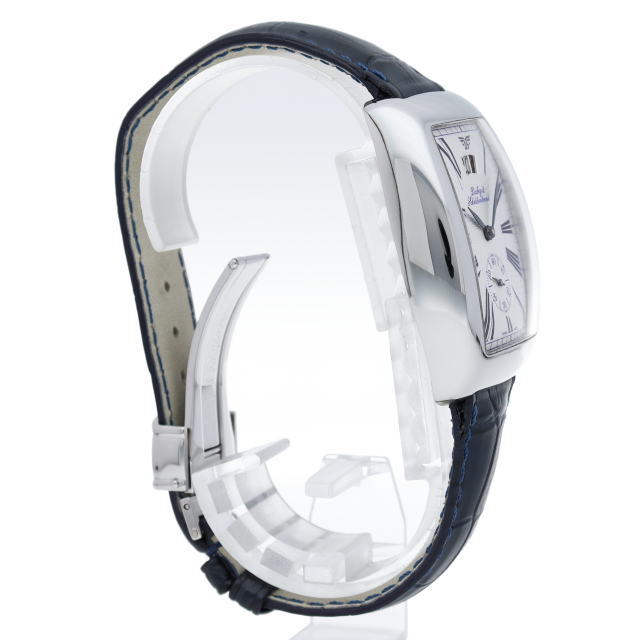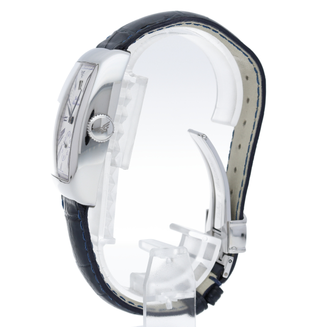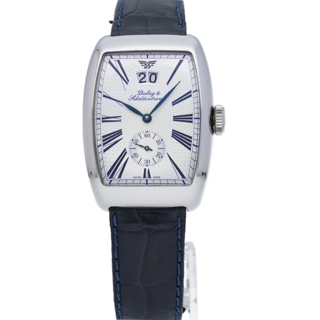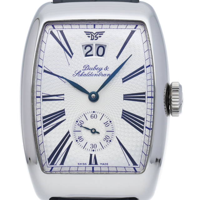 ダービー&シャルデンブランの代表モデルの『アエロディーン・デイト』です。1930年代に一世を風靡し、小物から自動車、航空機に至るまでが大きな影響を受けた流線形のシェイプと同様、30年代に大流行したアール・デコと呼ばれる様式のデザインとを組み合わせ、大ぶりなトノー・ケースにまとめ上げたのが特徴です。