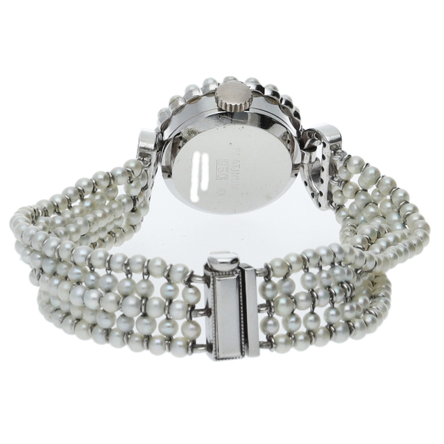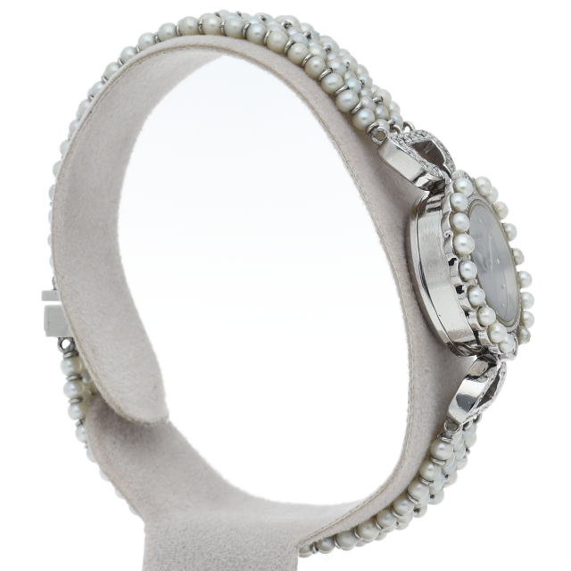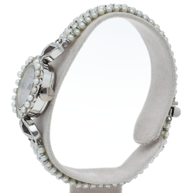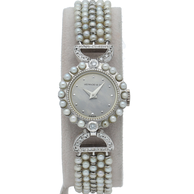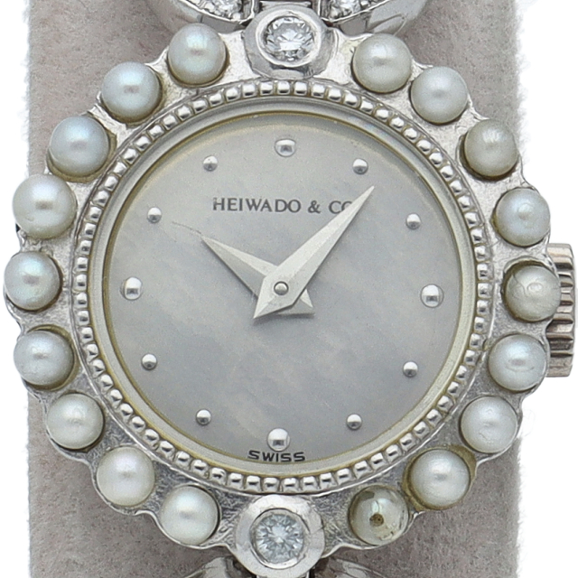 ケースにはプラチナを使用し、ベゼルとつなぎ部分にはダイヤモンドが施された高級感溢れる平和堂のレディース時計です。ブレス部分にはパールを使用しているため、上品で清潔感が漂います。