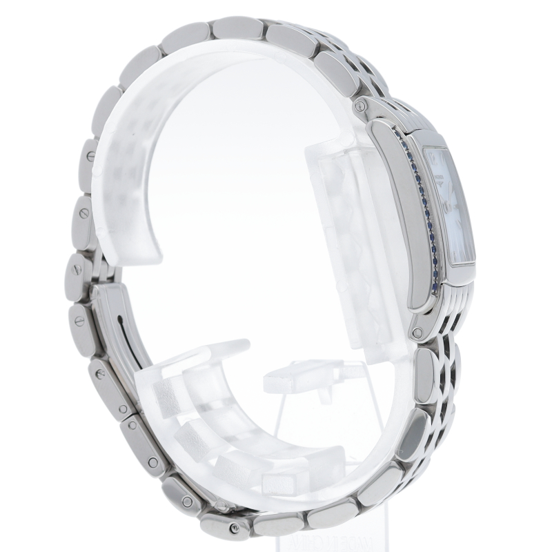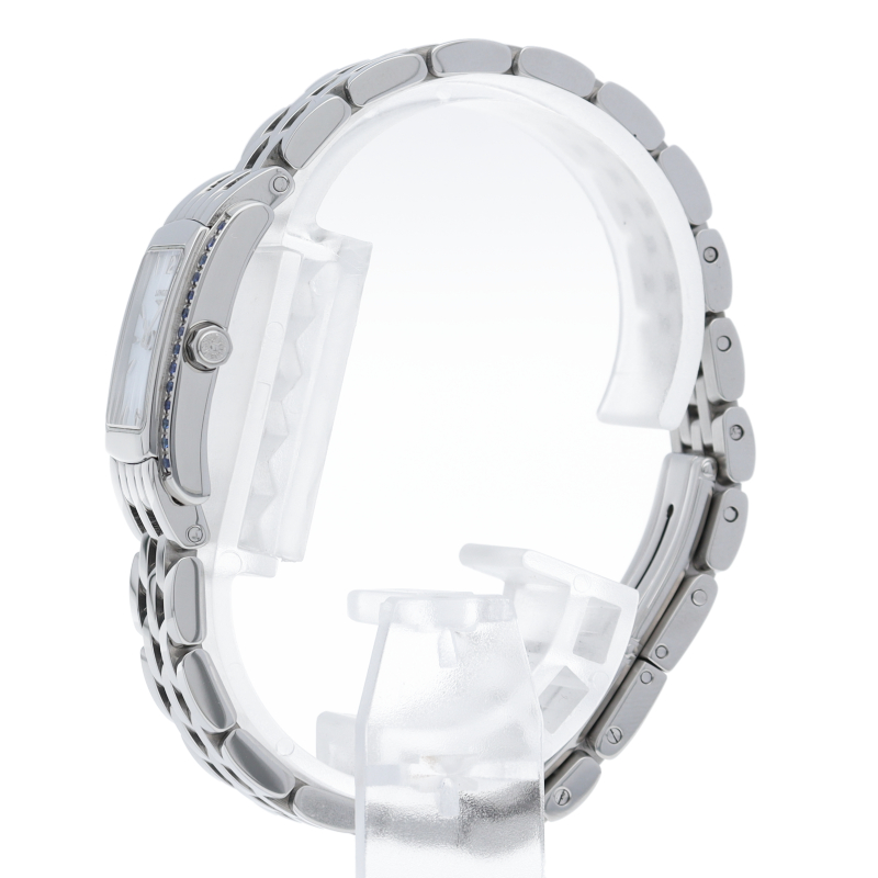 イタリア語で「甘い生活」という意味の「ドルチェビータ」。手首に沿うようにカーブがつけられたレクタンギュラー型のケースが装着感に優れたモデルで、柔らかなラインをまとった流行に流されない独特なデザインです。こちらは珍しいケースサイドにサファイアがセッティングされたモデルです。