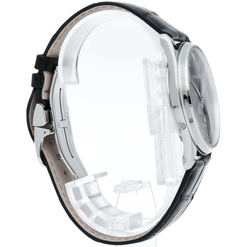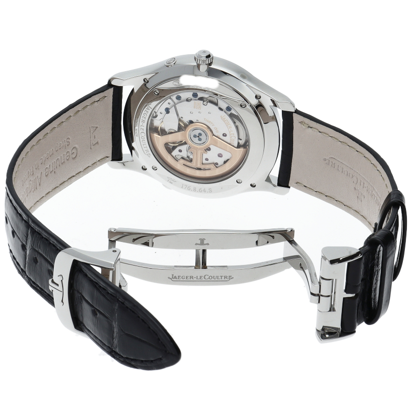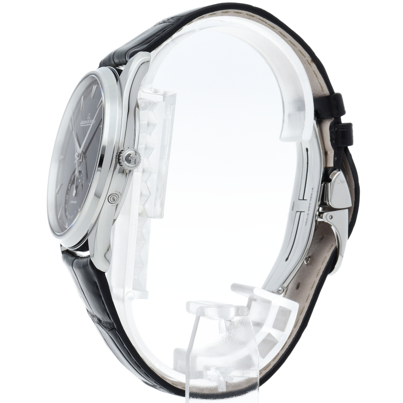 名門ジャガー・ルクルトが送り出す正統派のラウンド時計がマスターコレクションです。ウルトラスリムというネーミング通り、ケースの厚みが9.9ミリに抑えられています。43時間のパワーリザーブを備える、ジャガー・ルクルト自社製自動巻きムーブメントは925を搭載しています。自動巻きローターは22Kゴールド製となります。6時位置にはムーンフェイズ表示と日付表示が鎮座しクラシカルな雰囲気を演出してくれます。Q1368470/176.8。