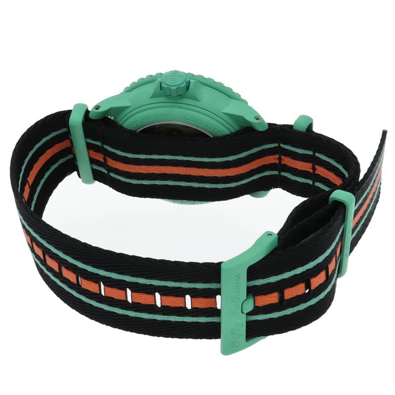 Blancpain X Swatchは、最初の本格的なダイバーズウォッチ、Fifty Fathomsへのオマージュです。このタイムピースは暴風雨の波がたたきつける氷山に似た神秘的な形のウミウシ、Tritoniella Belliが描かれています。時計のBioceramicケース、グラデーションの文字盤、漁網をリサイクルして作ったNATOストラップのカラーは、この動物の落ち着いたカラーからインスパイアされています。