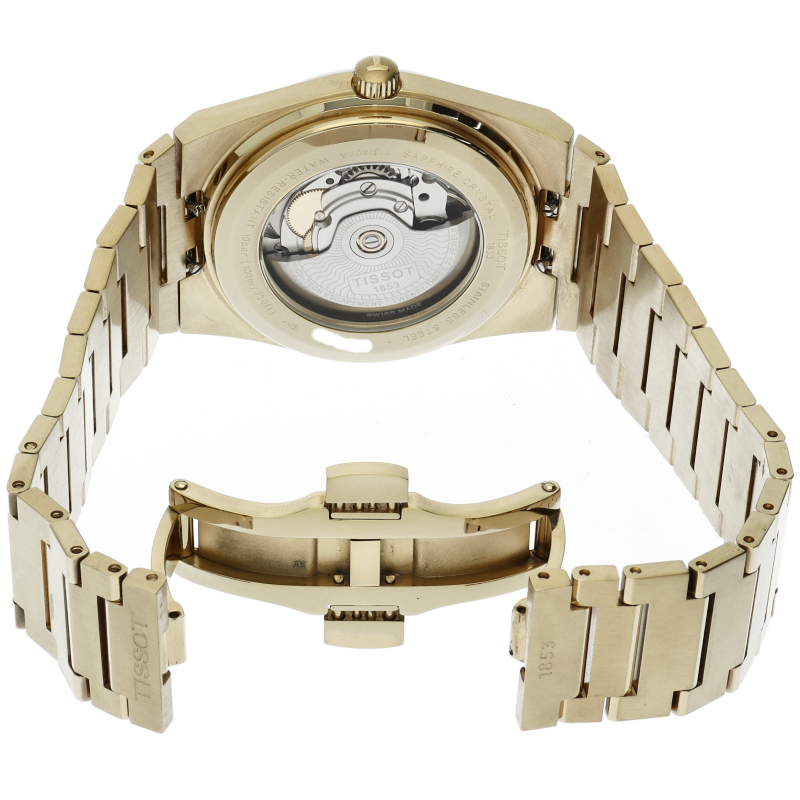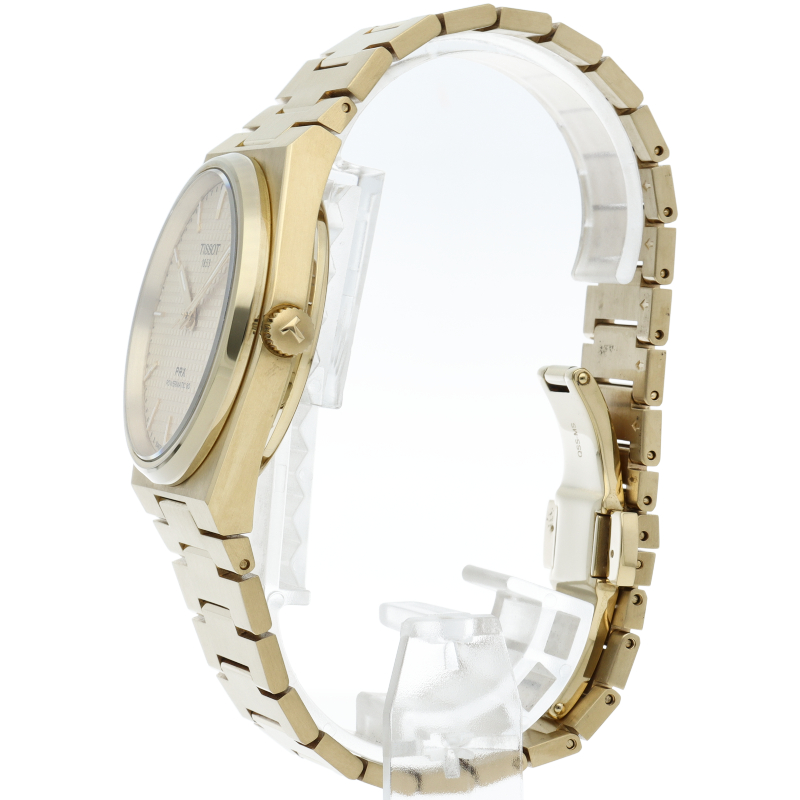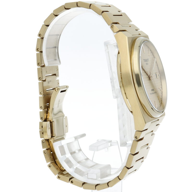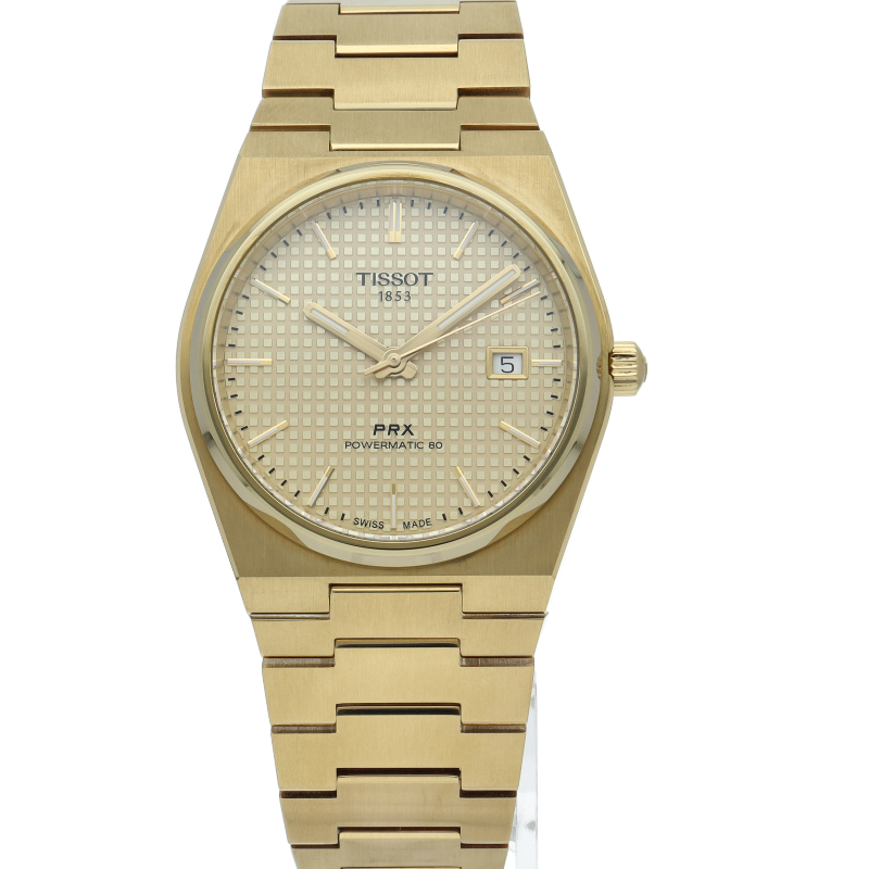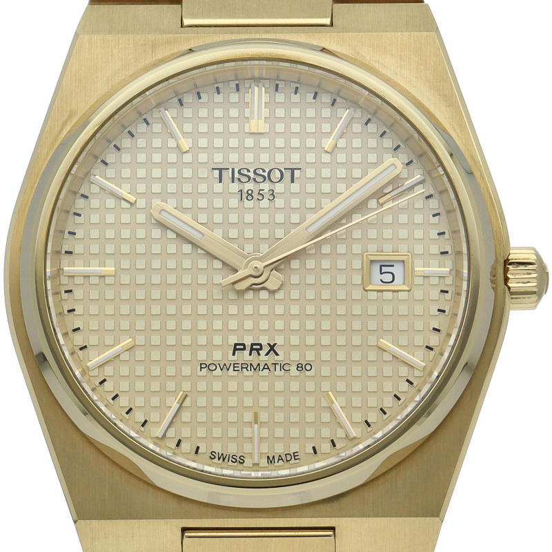 ゴールドのティソ PRX パワーマティック80は、スタイリッシュな雰囲気を演出します。自動巻きムーブメント「パワーマティック80」は、革新的なニバクロン製ヒゲゼンマイによる信頼性と精度を実現。80時間のパワーリザーブを誇るこのムーブメントは、多忙なライフスタイルに対応するために設計されたモダンなムーブメントです。