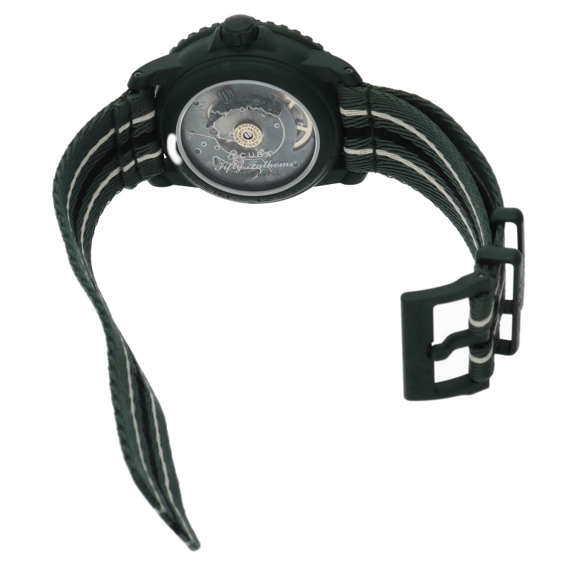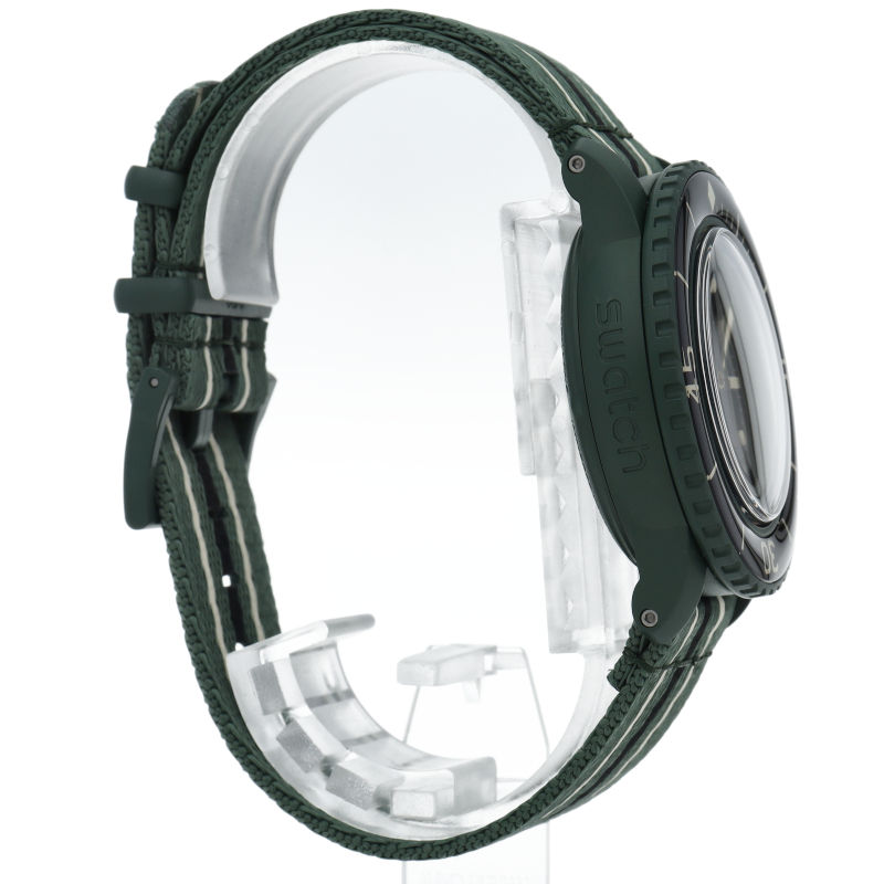 Blancpain X Swatchは、最初の本格的なダイバーズウォッチ、Fifty Fathomsへのオマージュです。グリーンのケースとクラウンにはBioceramic素材が使用されていて、ケースの左側に“Swatch”の文字が刻まれています。