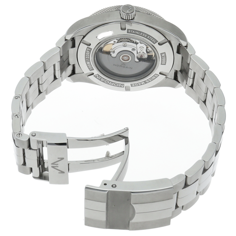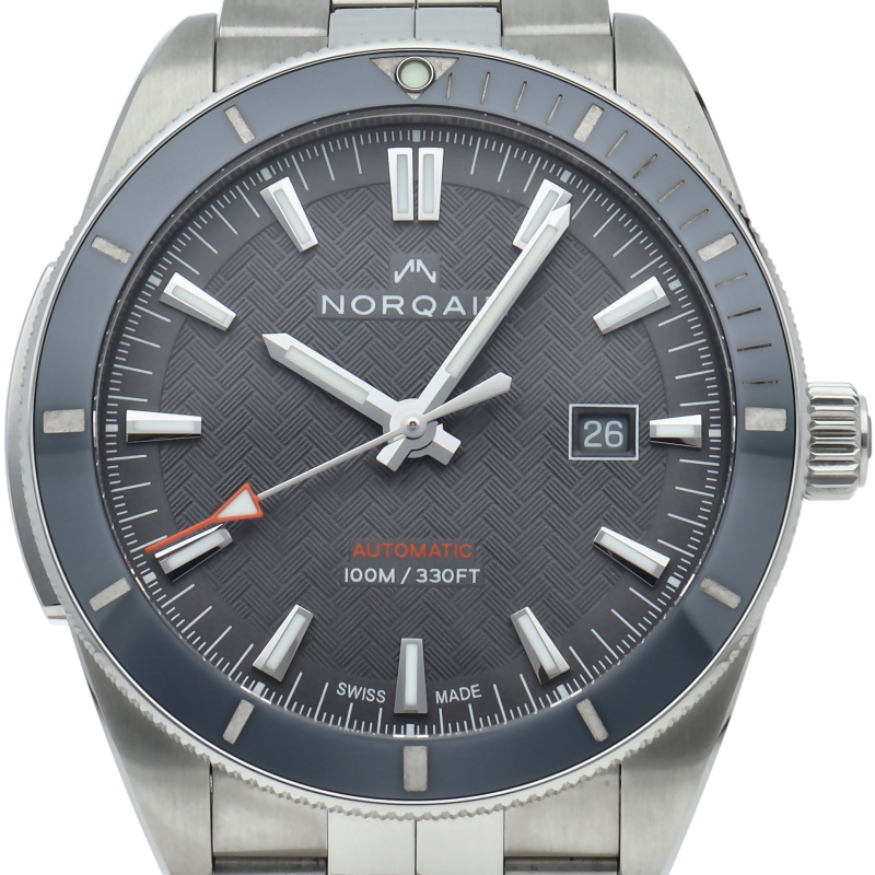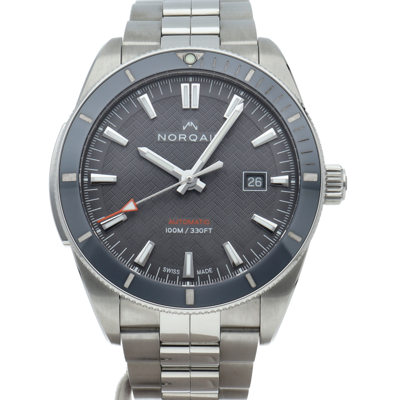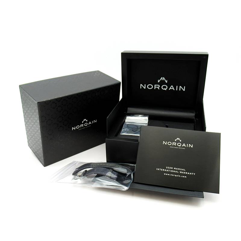 アドベンチャーコレクションの特徴は、スポーティな力強さです。製造技術の魂を込めた、精緻なローレット加工を施したベゼル、NORQAINのロゴパターンを施した文字盤を備えます。