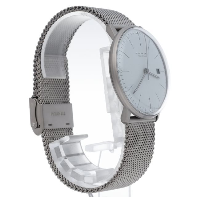 1861年創業のドイツブランド。こちらはバウハウス最後の巨匠と言われた彫刻家、故「マックス・ビル」氏が1962年にデザインした名品の復刻モデル。ドイツ・英国・米国・日本の電波を受信できる多周波電波式ソーラームーブメント J101.85搭載。