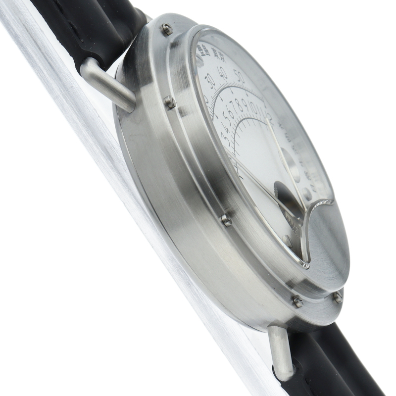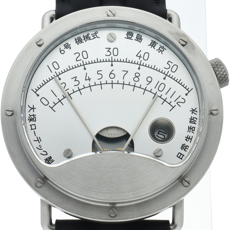 扇型に表示されるアナログメーター。旧モデル6号から、動作安定性と耐久性の向上を図るために設計、使用素材、加工方法を改良。外装の変更としては時分針の両サイドや、ビスの頭(ベゼルや文字盤上)に面取りを施している。ケース素材をSUS303からSUS316Lに、風防をミネラルガラスからサファイアクリスタルガラスに変更。ブランドロゴを刻印した尾錠と専用デザインのストラップを採用した。