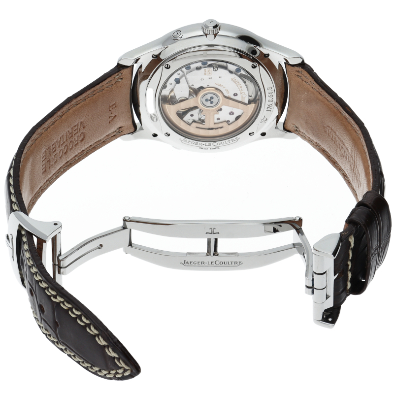 名門ジャガー・ルクルトが送り出す正統派のラウンド時計がマスターコレクションです。ウルトラスリムというネーミング通り、ケースの厚みが9.9ミリに抑えられています。43時間のパワーリザーブを備える、ジャガー・ルクルト自社製自動巻きムーブメントは925を搭載しています。自動巻きローターは22Kゴールド製となります。6時位置にはムーンフェイズ表示と日付表示が鎮座しクラシカルな雰囲気を演出してくれます。Q1368470/176.8。